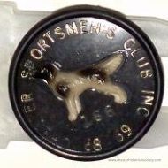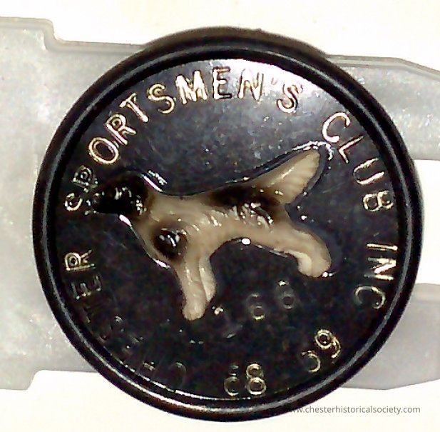 A circular plastic black badge featuring a raised design of a dog in the center, likely representing a hunting or sporting dog, surrounded by the text “CHESTER SPORTSMEN'S CLUB INC” in gold lettering on the edge. Pin #166.Collection
