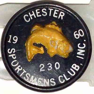 The image shows a circular plastic badge from "Chester Sportsmens Club, Inc." with a black background and white lettering. In the center, there is a raised, yellow fish design. The numbers "230" appear below the fish, and "19" and "60" are on either side, indicating the date. The badge likely represents membership or association with the club.