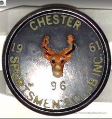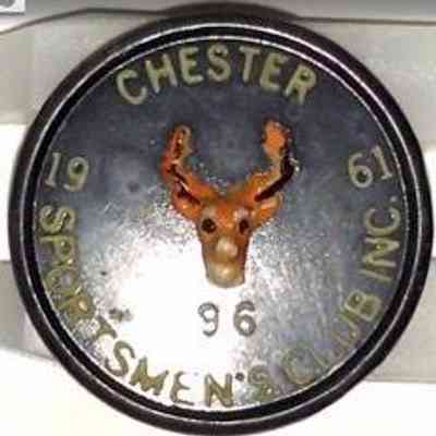 The image displays a circular plastic badge with a black background featuring a small, central depiction of a deer's head, showcasing detailed antlers in brown and cream colors. Surrounding the deer emblem, the badge is inscribed with text, including "CHESTER SPORTSMEN'S CLUB INC." around the edge, with the year "1961." At the bottom, the number "96."