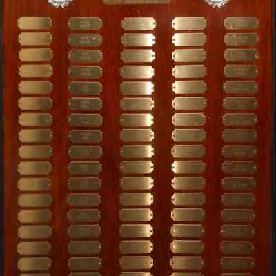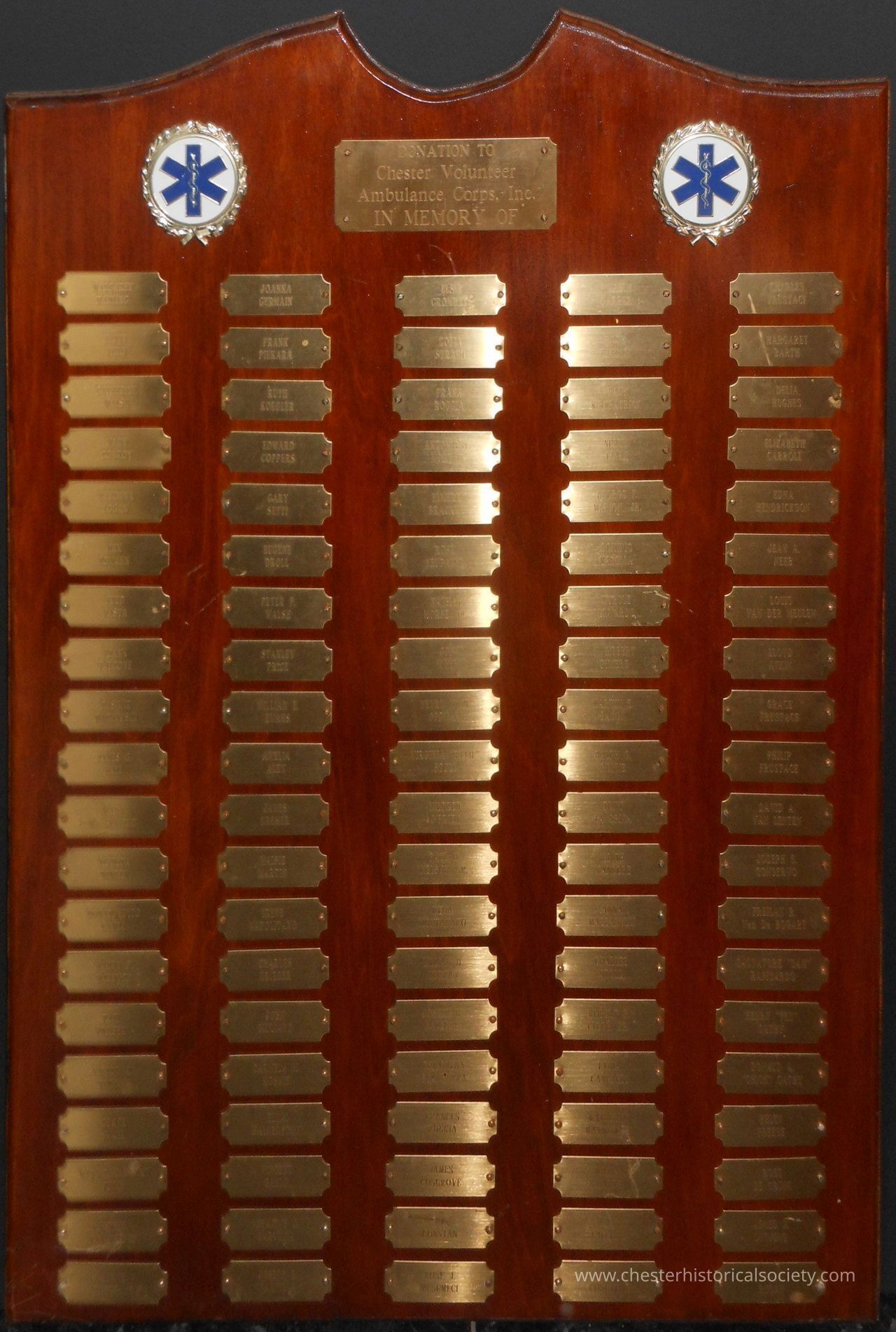 The image shows a wooden memorial plaque with multiple rows of gold nameplates, each engraving representing a tribute in memory of individuals. At the top, it reads "Donation to Chester Volunteer Ambulance Corps, Inc. In Memory Of," signifying the purpose of homage. Flanking the engraving are two emblems with a blue Star of Life insignia, associated with emergency medical services. The polished surface of the plaque reflects light, emphasizing its significance and the respect accorded to the listed individuals.