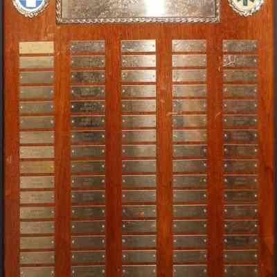A wooden Chester Volunteer Ambulance Memorial Donations Plaque with numerous engraved brass nameplates arranged in several columns.Collection