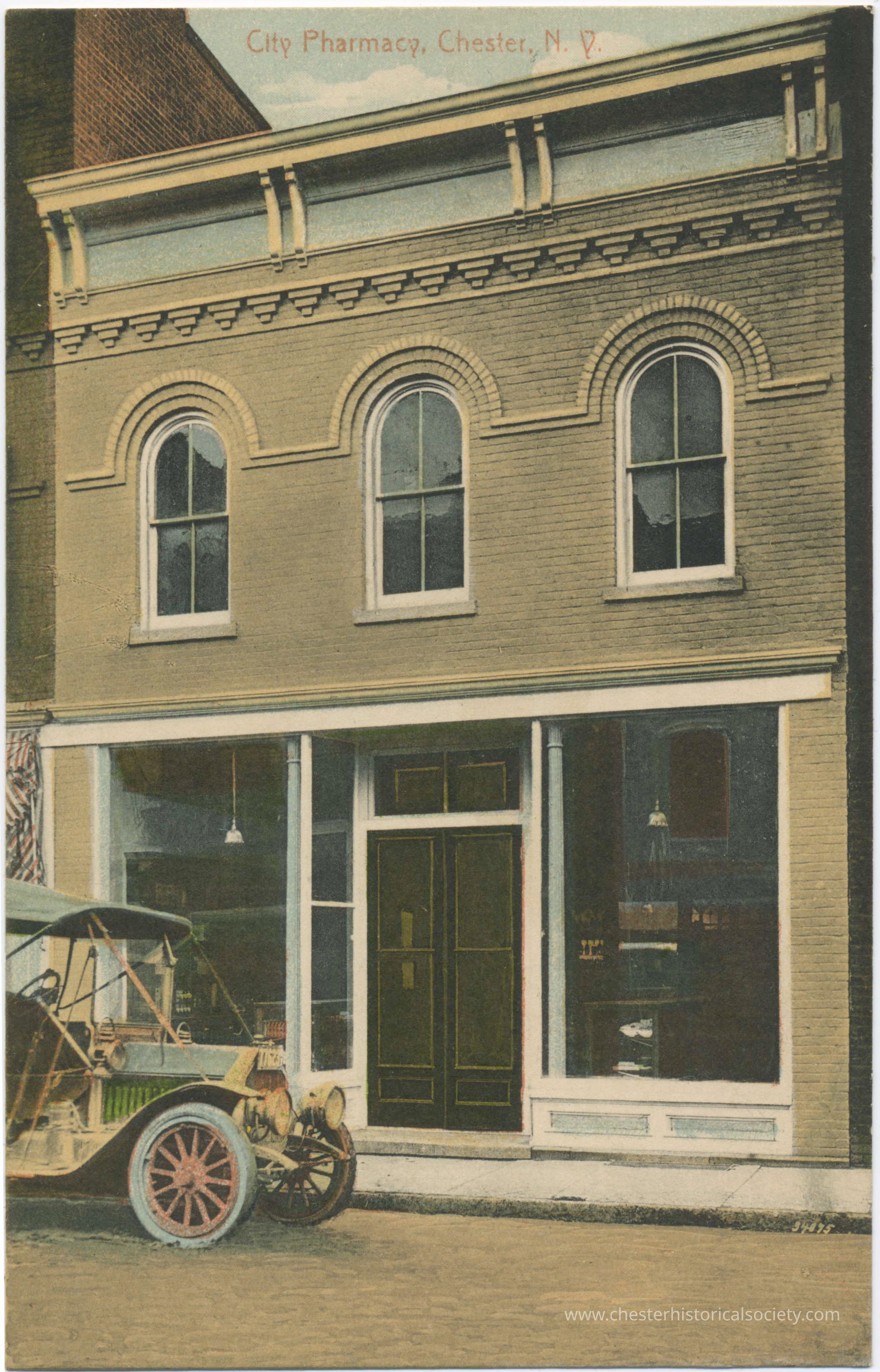 This unused colorized photo postcard shows City Pharmacy located in downtown Chester, NY, featuring a two-story brick building with decorative detailing and arched windows. In front, an early-model open automobile is parked on the street, indicating a period likely in the early 20th century. The pharmacy's windows display various items, suggesting it is a place offering sundry goods alongside medicationsSubject Person/Organization