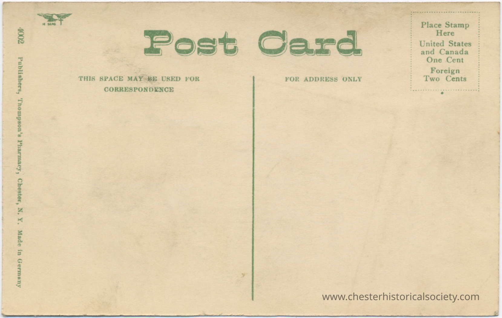 4002 Publishers, Thompson's Pharmacy, Chester, N. Y. Made in Germany