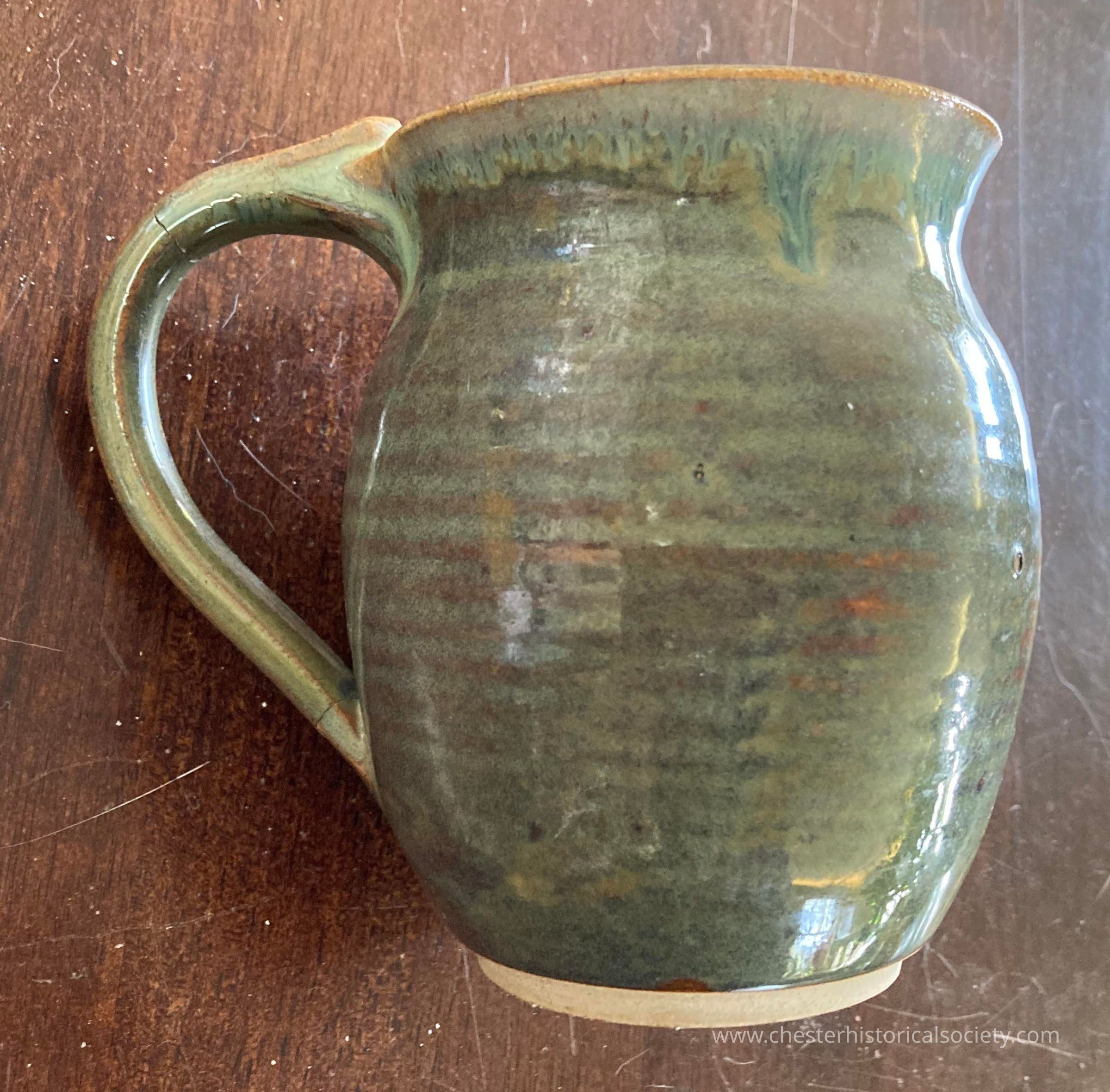 Green glazed ceramic mug with overlay - Craft Fair 1997 Sugar Loaf, NY, signed on bottom Dear Sylvia, thanks, Sumari, 1997.
