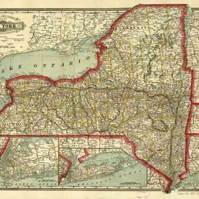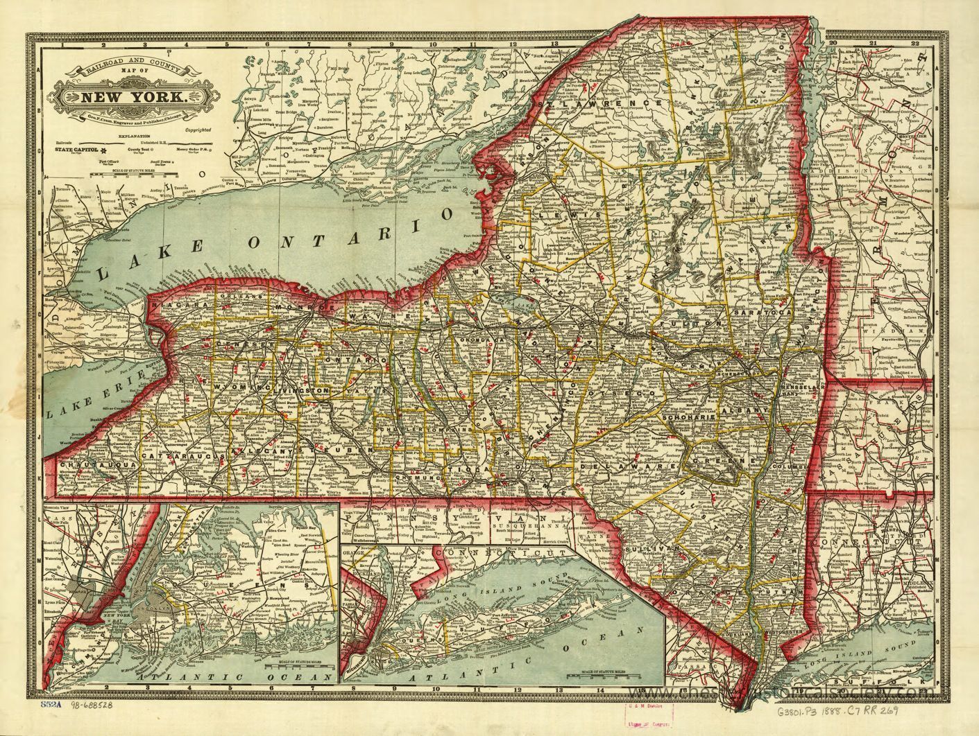 This 1888e map of the state of New York, prominently displaying its borders with a red outline and detailing various counties within the state using yellow lines, accompanied by numerous cities and towns labeled in black text; significant geographical features include Lake Ontario and Lake Erie to the northwest, while an inset at the bottom highlights the southern portion of New York, including Long Island, with maritime boundaries extending into the Atlantic Ocean, making it a detailed representation of transportation routes and settlements as they were mapped.