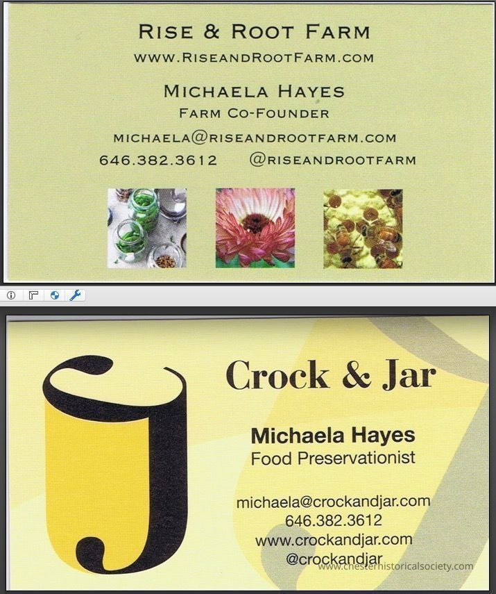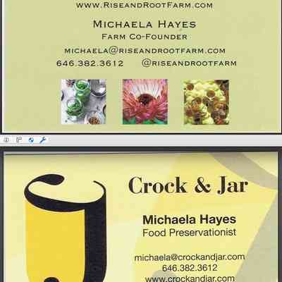A business card for Michaela Hayes' Rise & Root Farm and Crock & Jar operations. Cheser operations started about 2015.Category
