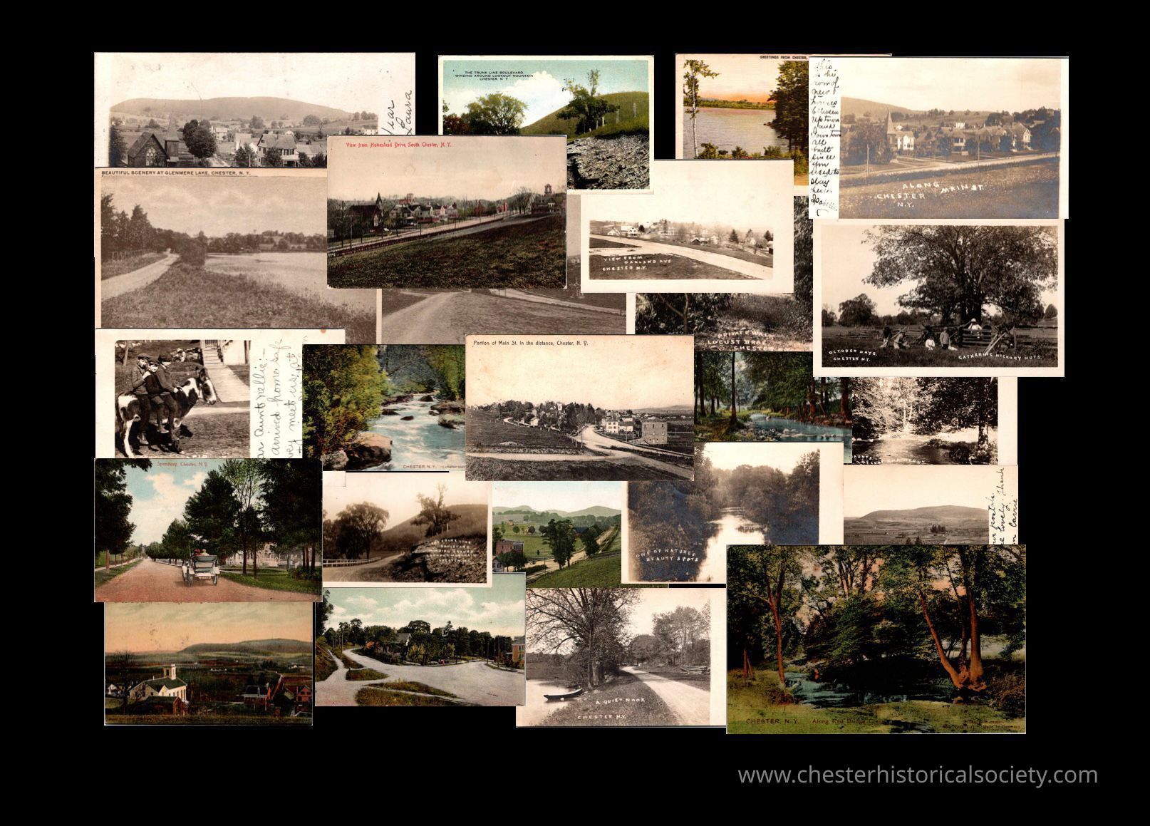 The image is a collage of vintage postcards depicting various scenic landscapes and views around Chester, NY. These postcards feature different locations, likely from the early to mid-20th century, showcasing rural and small-town scenes. Many of the cards depict serene countryside environments, with rolling hills, winding roads, quaint buildings, and expansive fields. Some postcards feature bodies of water, including rivers and lakes, while others highlight lush greenery, trees, and picturesque open spaces. There are instances of small towns with visible buildings, pathways lined with trees, as well as a few people and livestock in certain images. Collectively, the postcards convey a sense of nostalgia, capturing the tranquil, rural beauty of a bygone era.