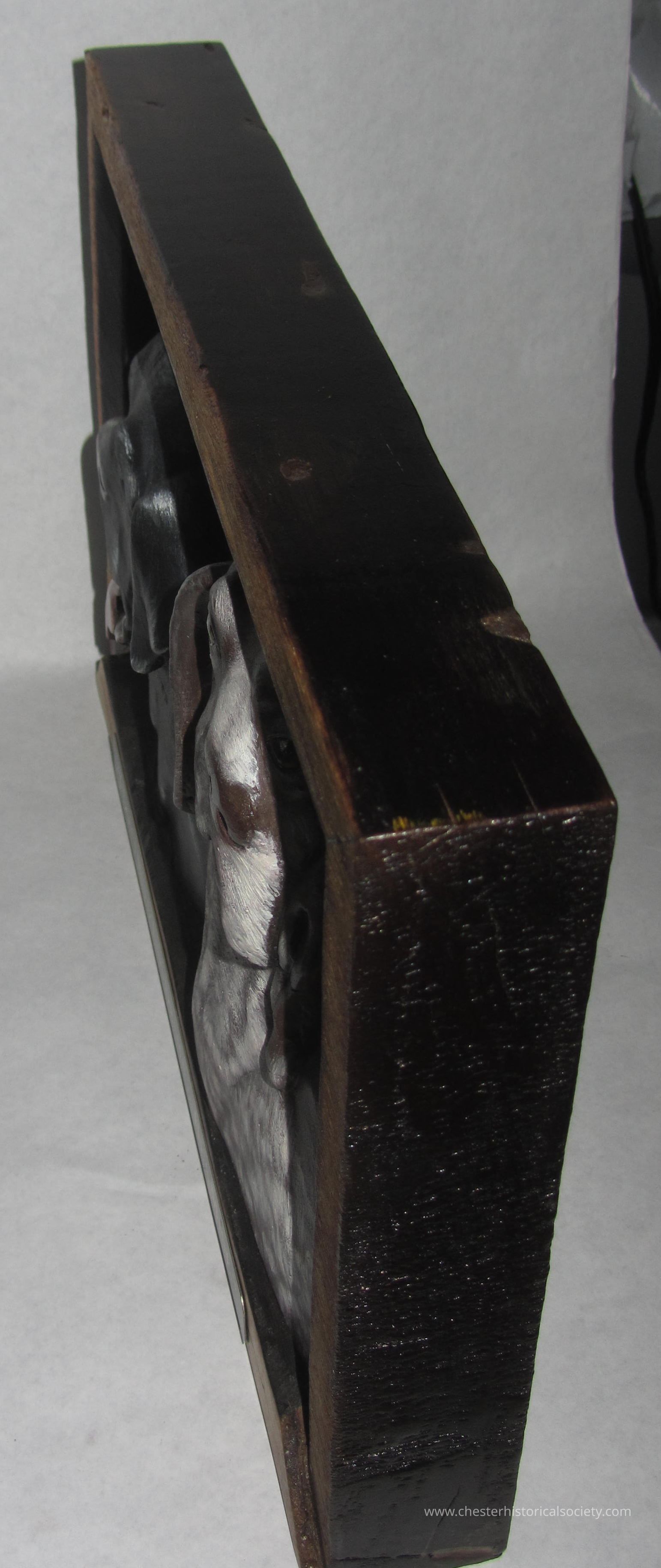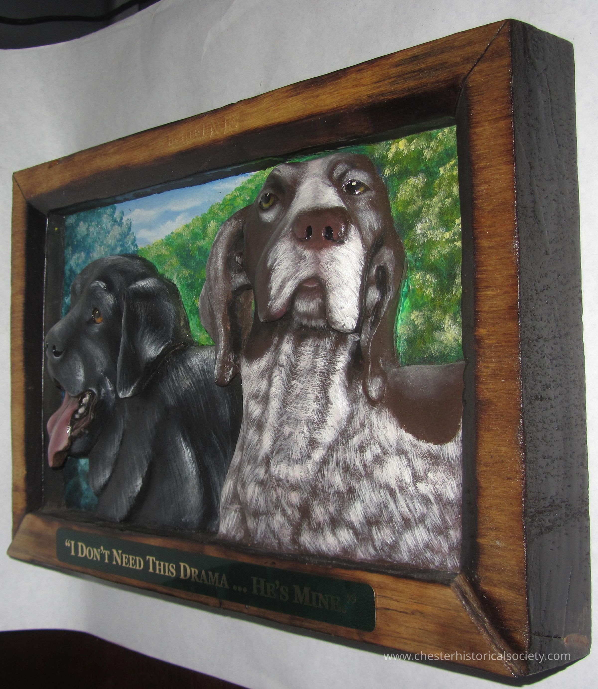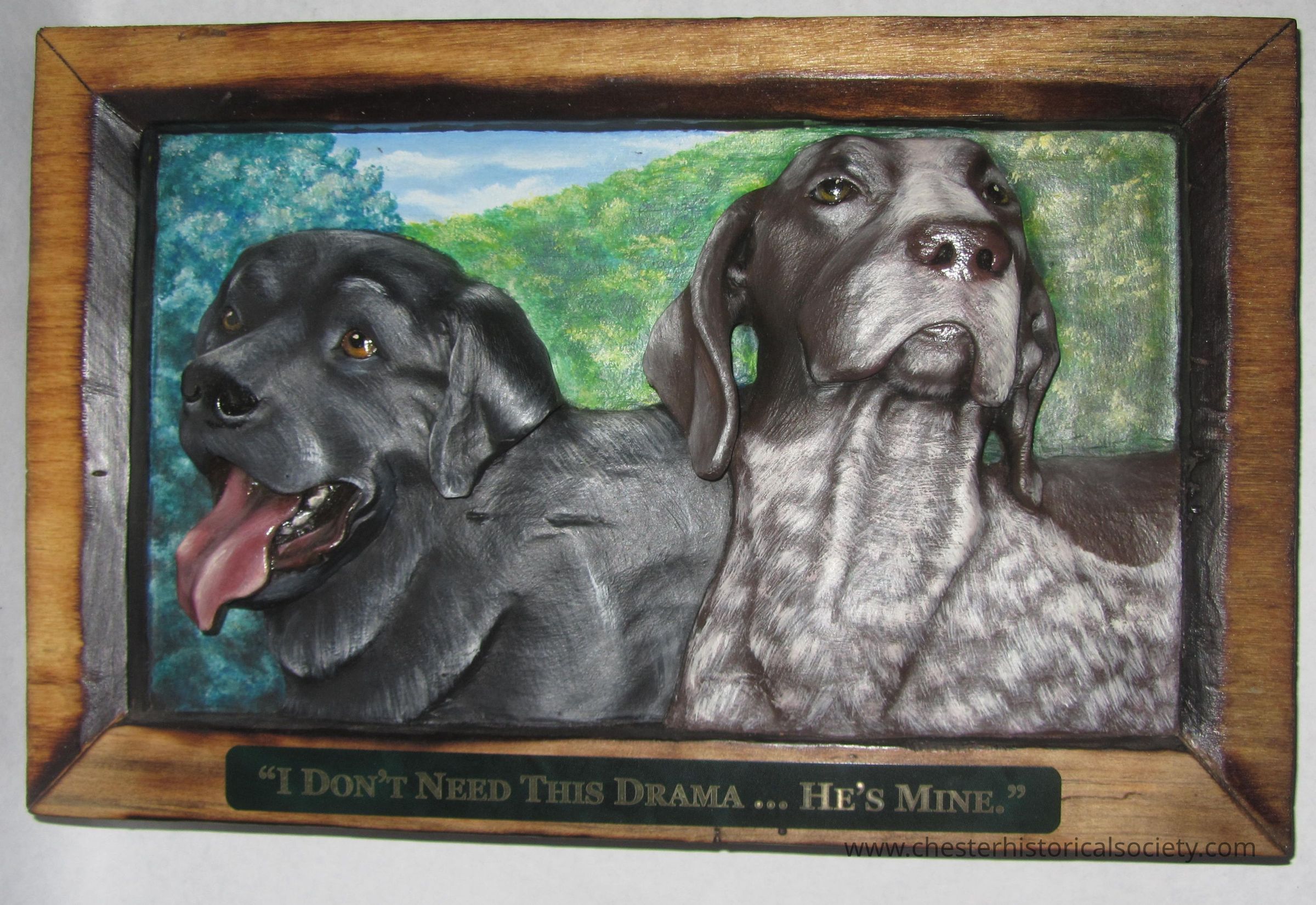 Carved portrait of Clay Boone's dogs - l-r: Cody Bear, Brat Wurst with a humorous quote beneath them about drama.Category