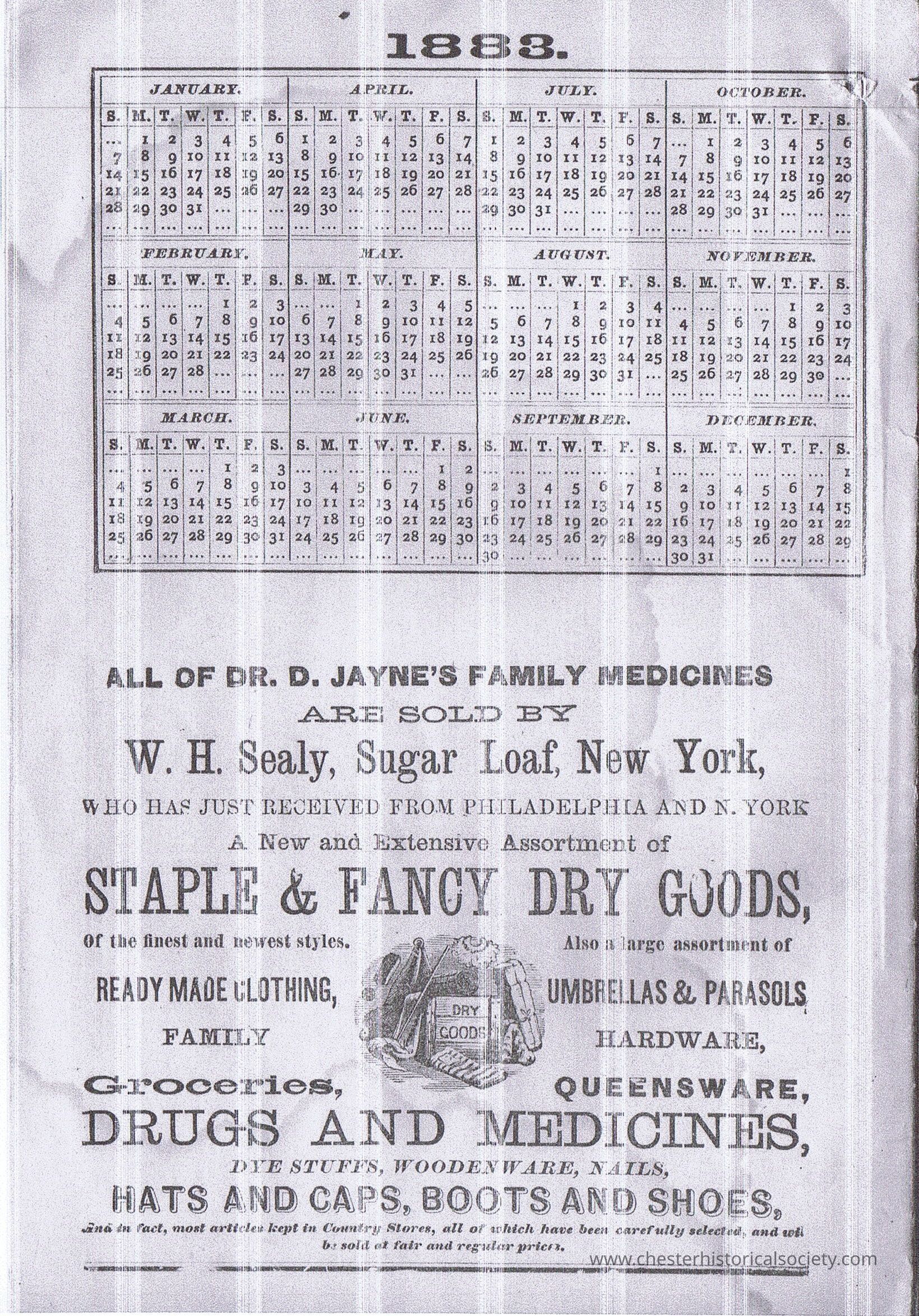 A vintage 1883 medical almanac cover featuring ornate designs and an urban scene, including on the back cover an advertisement promoting Dr. D. Jayne’s Family Medicines, sold by W. H. Sealy in Sugar Loaf, New York.Context