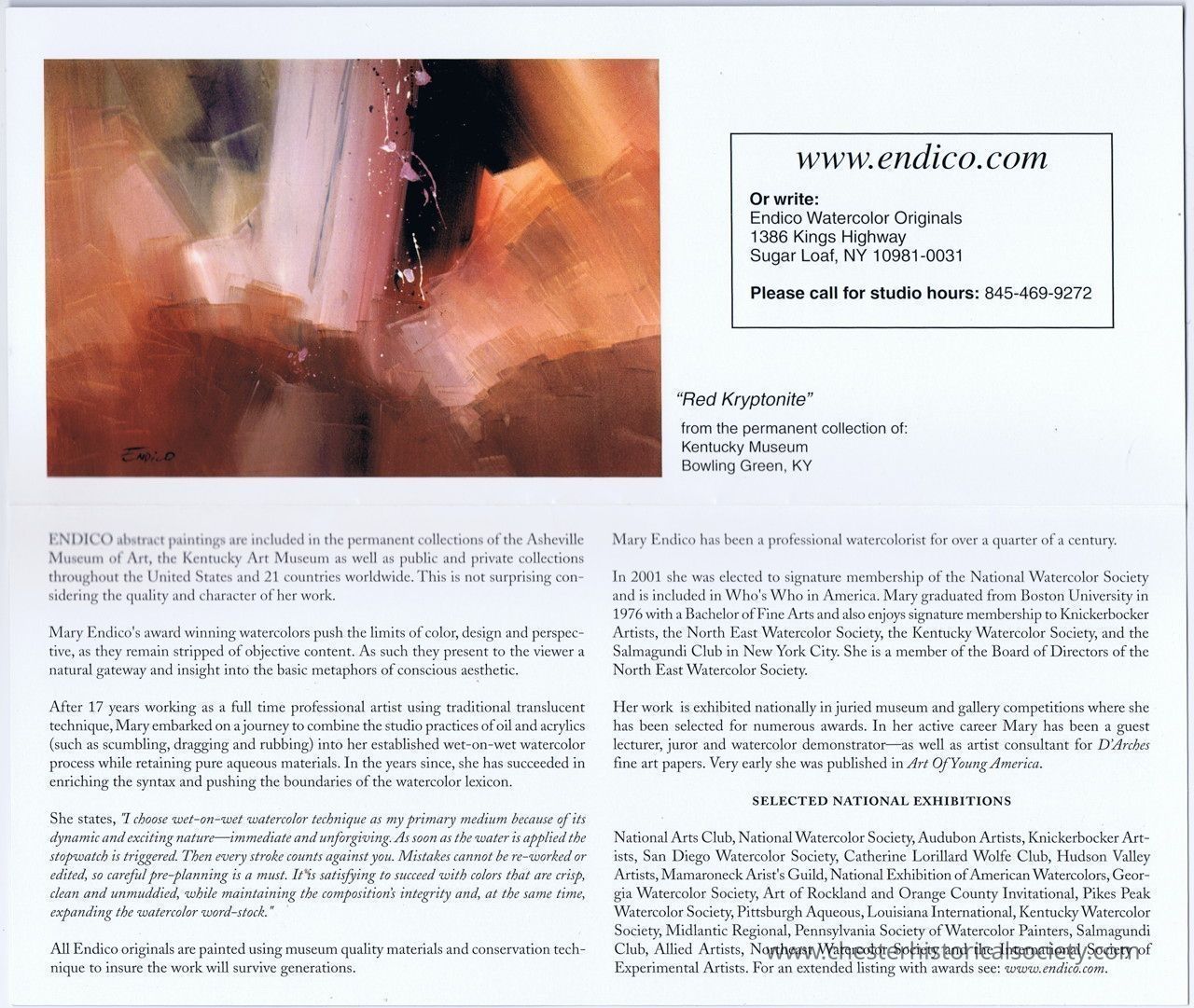Endico’s abstract paintings are included in the permanent collections of the Asheville Museum of Art, Kentucky Art Museum as a private and public collections throughout the United States in 21 countries worldwide. This is not surprising considering the quality and character of her work.