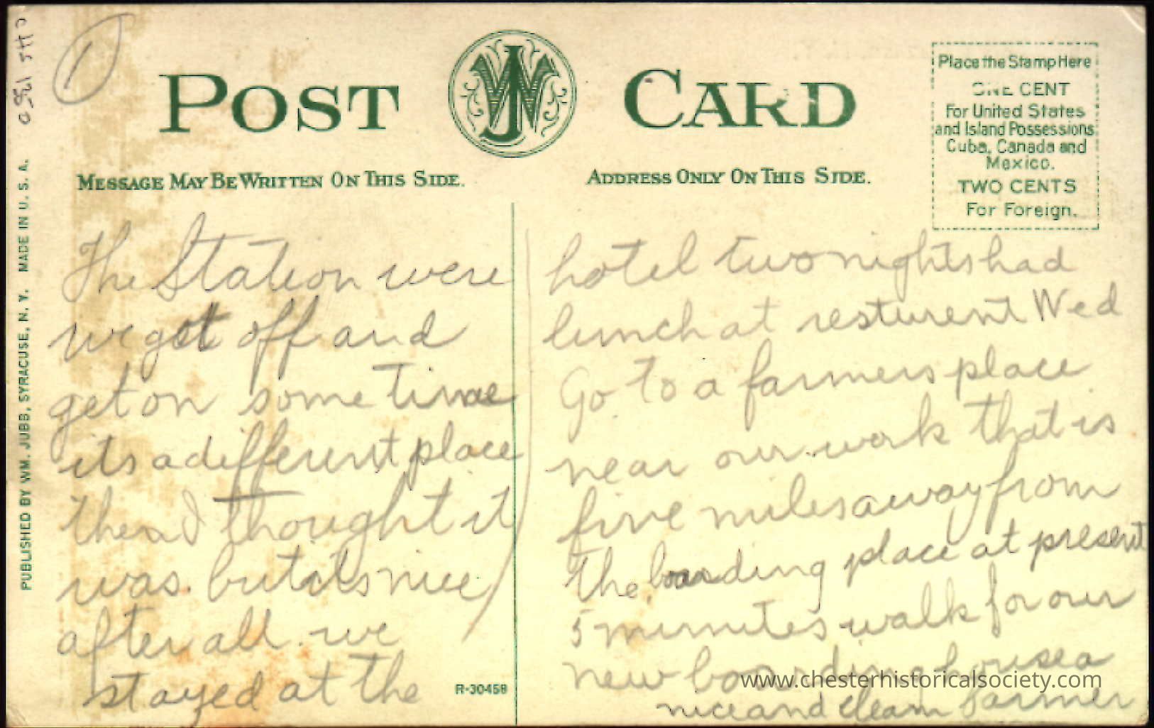 This colorized photo postcard depicts Erie Depot in Goshen, New York, showing a historic train station with horse-drawn carriages, people milling about, and a sunset-streaked sky that casts a warm hue over the scene, emphasizing typical railroad station architecture. The address side of this divided-back postcard features handwritten messages. There's a green print of "POST CARD" at the top and a circular logo with a "WJ" monogram" in the center. The right side of the card, meant for addresses, includes postal rate information and a placeholder for a stamp. The handwritten text recounts personal experiences, mentioning a stay at a hotel, having lunch at a restaurant, and visiting a farmer's place nearby.Subject Place