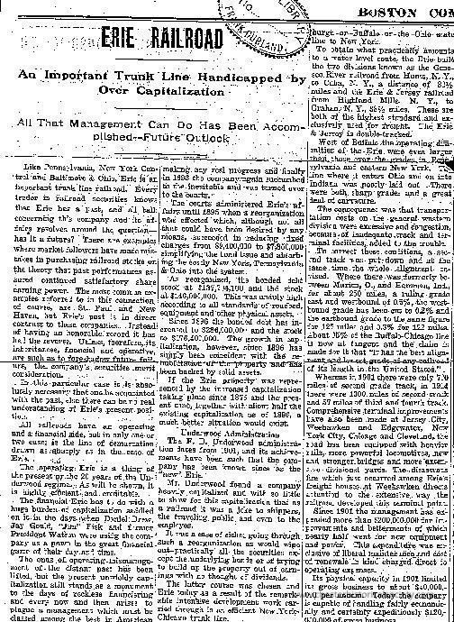 Article on the “Erie Railroad - An Important Trunk Line Handicapped by Over Capitalization” clipped by Frank DurlandCollection