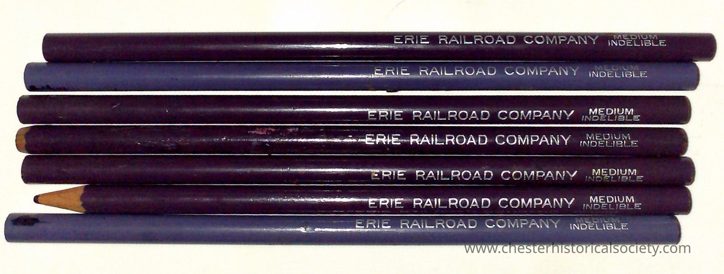 A group of seven dark blue pencils are aligned, displaying "Erie Railroad Company" and "Medium Indelible." Five unused, one partially sharpened, and used.Context