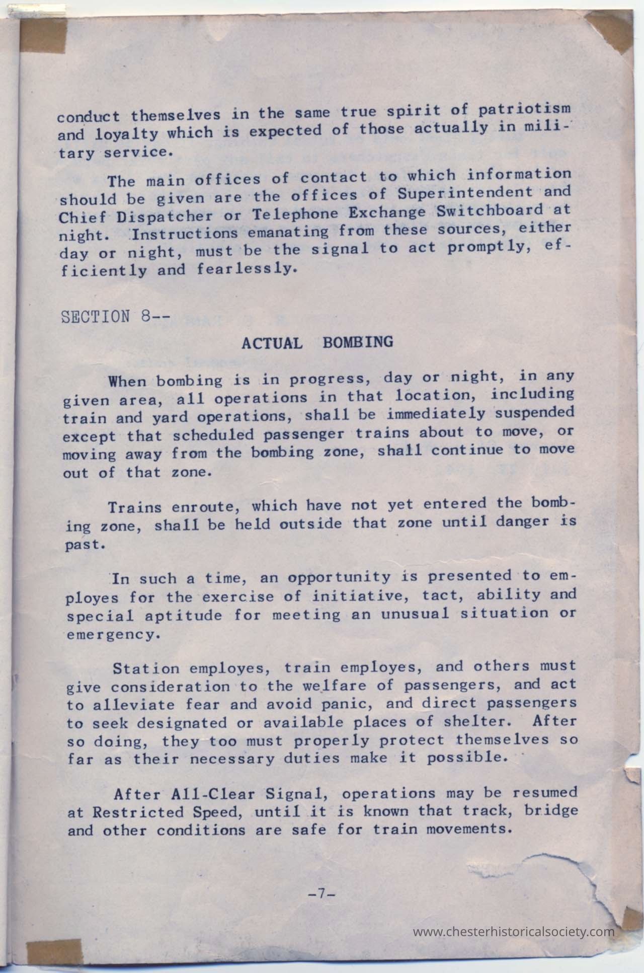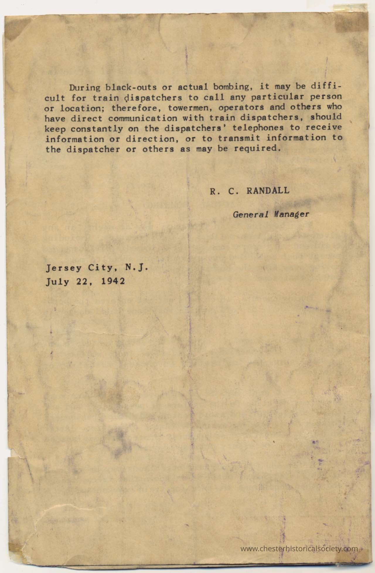 During black-outs or actual bombing, it may be difficult for train dispatchers to call any particular person or location; therefore, towermen, operators and others who have direct communication with train dispatchers, should keep constantly on the dispatchers’ telephones to receive information or direction, or to transmit information to the dispatcher or others as may be required.