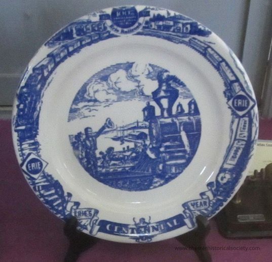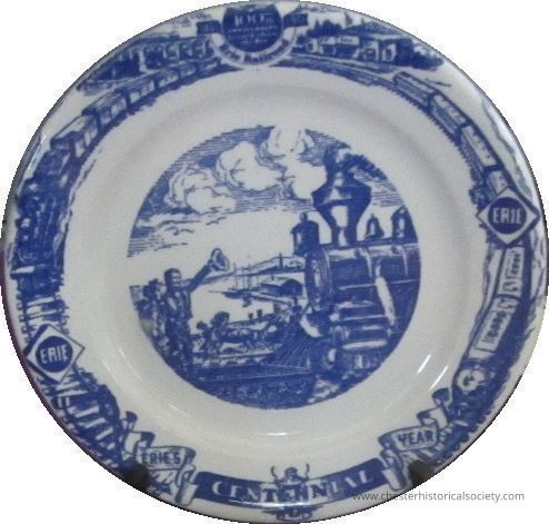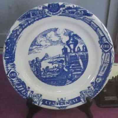 A commemorative plate with intricate blue designs on a white background. The central scene features historical imagery, including a canal boat, a bridge, and an industrial setting with smoke rising from a factory chimney, indicative of the industrial era. Surrounding the central scene, the border of the plate is adorned with additional intricate decorations, likely representing symbolic elements related to the Erie Railroad Centennial.Collection