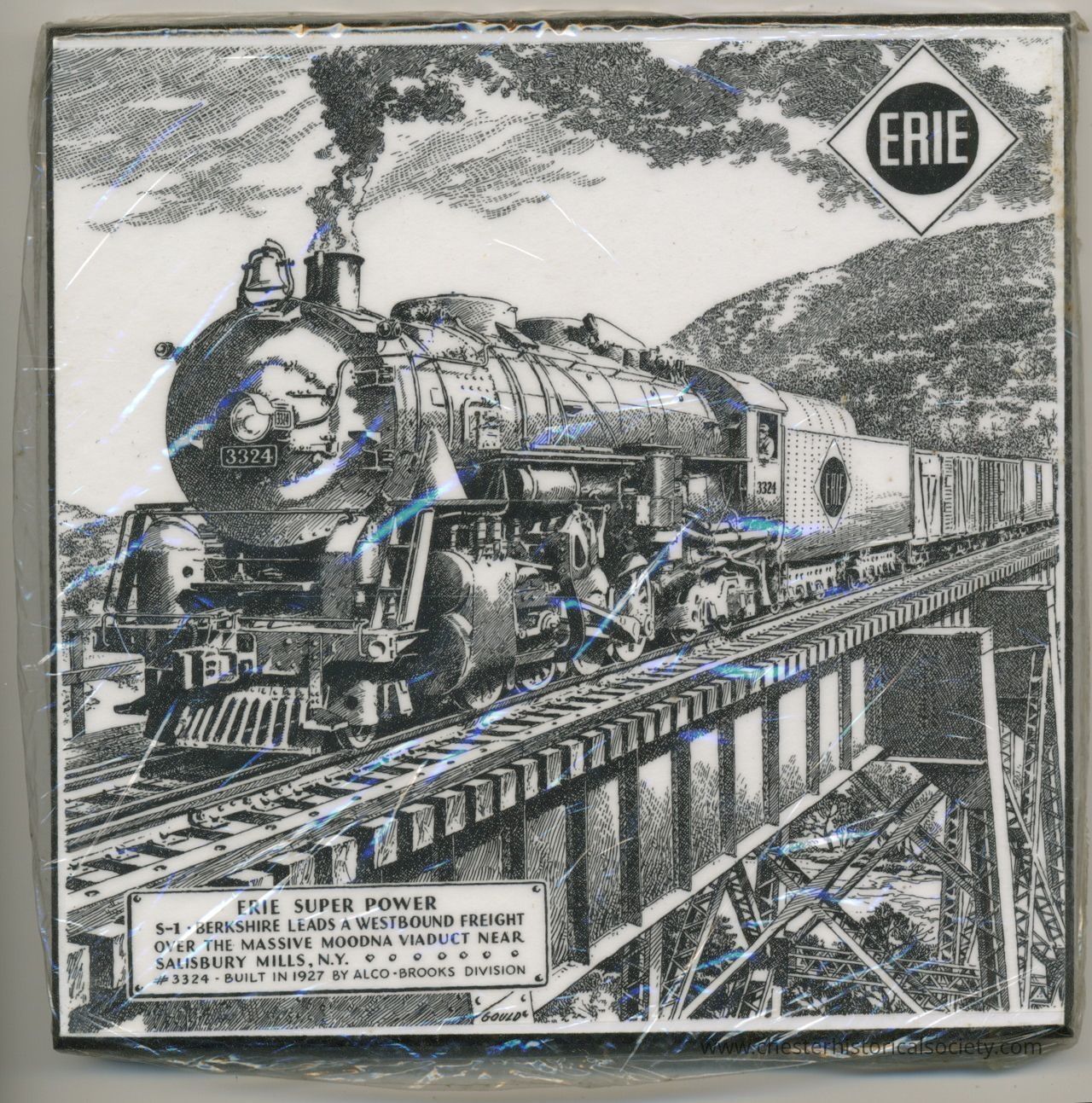 A decorative tile celebrating "Erie Super Power," a S-1 Berkshire leads a westbound freight over the Massive Moodna Viaduct near Salisbury Mills, N. Y. in original plastic wrap.Collection