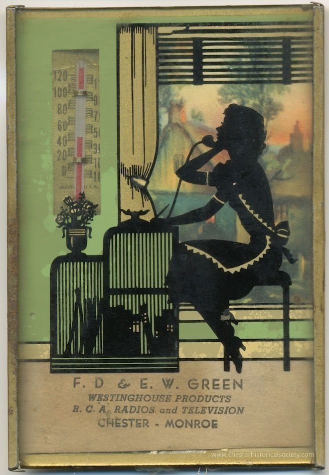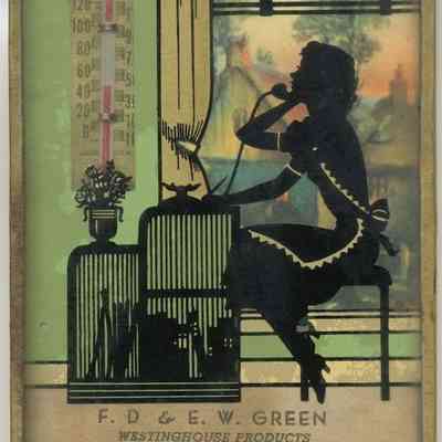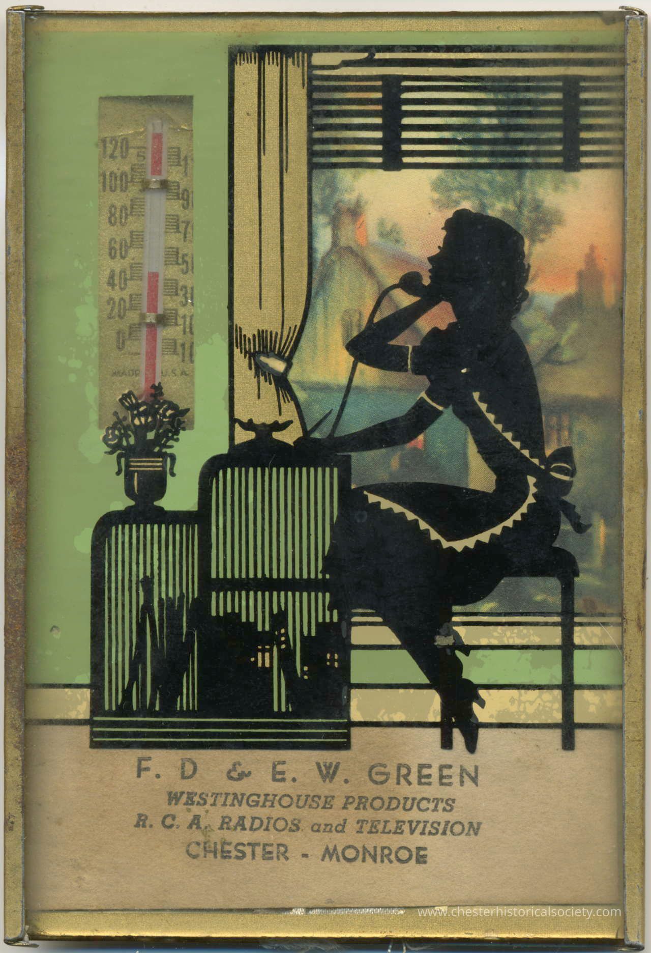 This promotional metal-framed image features a vintage-style silhouette illustration of a woman talking on a phone while seated by a window with curtains. Next to her is a thermometer displaying temperatures in Fahrenheit and Celsius. Below, there's a label reading "F. D. & E. W. Green, Westinghouse Products, R.C.A. Radios and Television, Chester—Monroe."Collection