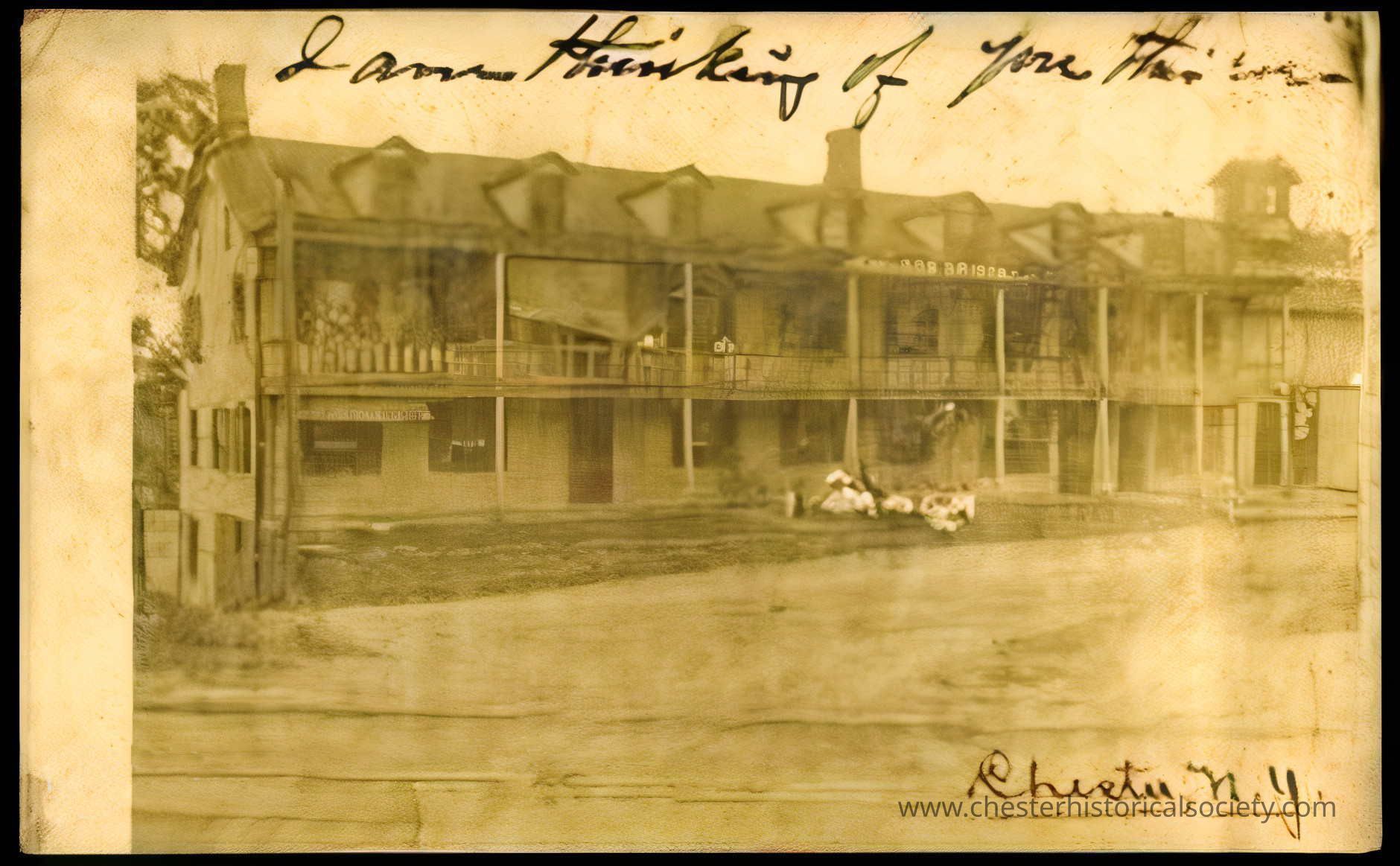 This photo postcard shows the Howland House Hotel, double-story building with balconies and distinctive roofing. A small group of people appear to be lounging on the front lawn, opposite the Erie RR Station at Chester.Subject Person/Organization