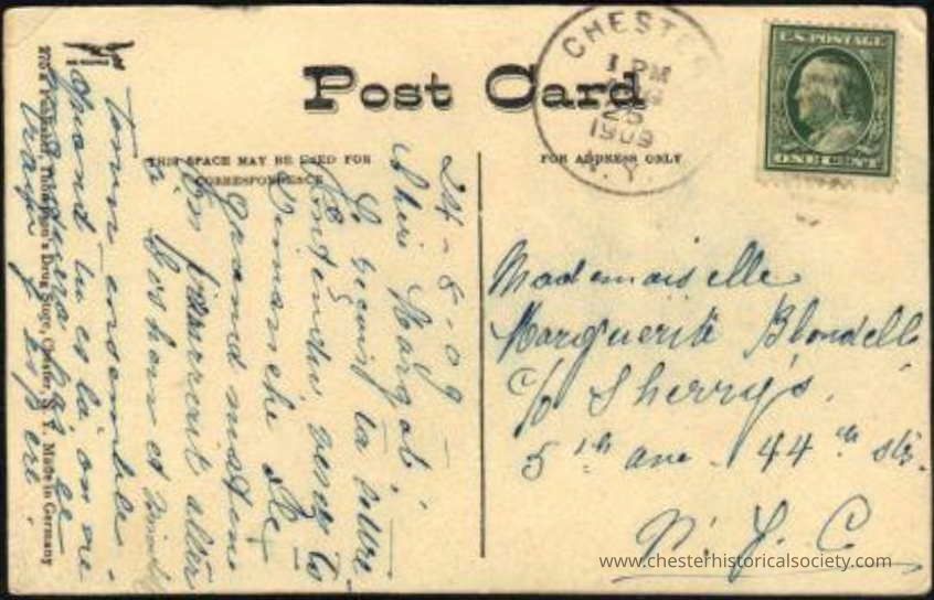 This colorized photo postcard shows the view of Chester, N.Y. from Oakland Ave. looking in a southerly direction starting with St. Paul’s Episcopal Church. The reverse side of this postcard dated August 24, 1909, features a green one-cent Benjamin Franklin stamp and a postmark. The card is densely covered with handwritten cursive script in blue ink. The message, written in French on the left side, is designated for correspondence, while the right side, specified for the address only, contains Mademoiselle Marguerite Blondell's name and address in New York City.Subject Place
