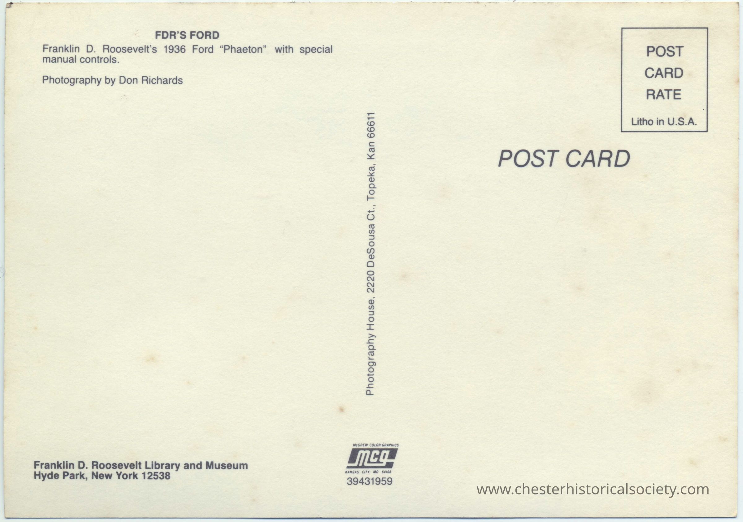 This unused color photo postcard depicts Franklin D. Roosevelt's 1936 Ford "Phaeton", with special hand controls., a classic deep blue convertible car displayed in the lower level of the Franklin D. Roosevelt Library and Museum, as evidenced by the polished wooden floor and the structured lighting above. The vehicle, seemingly from a bygone era, features a sleek design with chrome accents and white-walled tires. Its doors are open, inviting a closer look, while a backdrop of a serene forest scene adds a contrasting natural element to the display. The image displays the back side of this postcard which features information about Franklin D. Roosevelt's 1936 Ford "Phaeton" with special manual controls, housed at the Franklin D. Roosevelt Library and Museum in Hyde Park, New York. The postcard, photographed by Don Richards, also shows the printing details including "Litho in U.S.A." and a postcard rate box in the top right corner.Subject Person/Organization