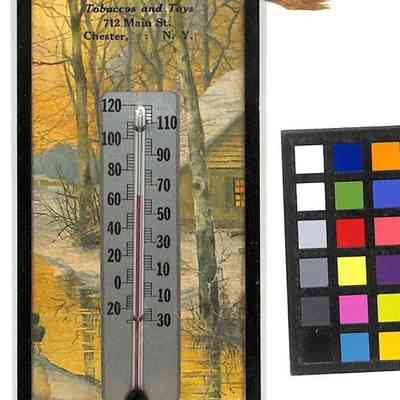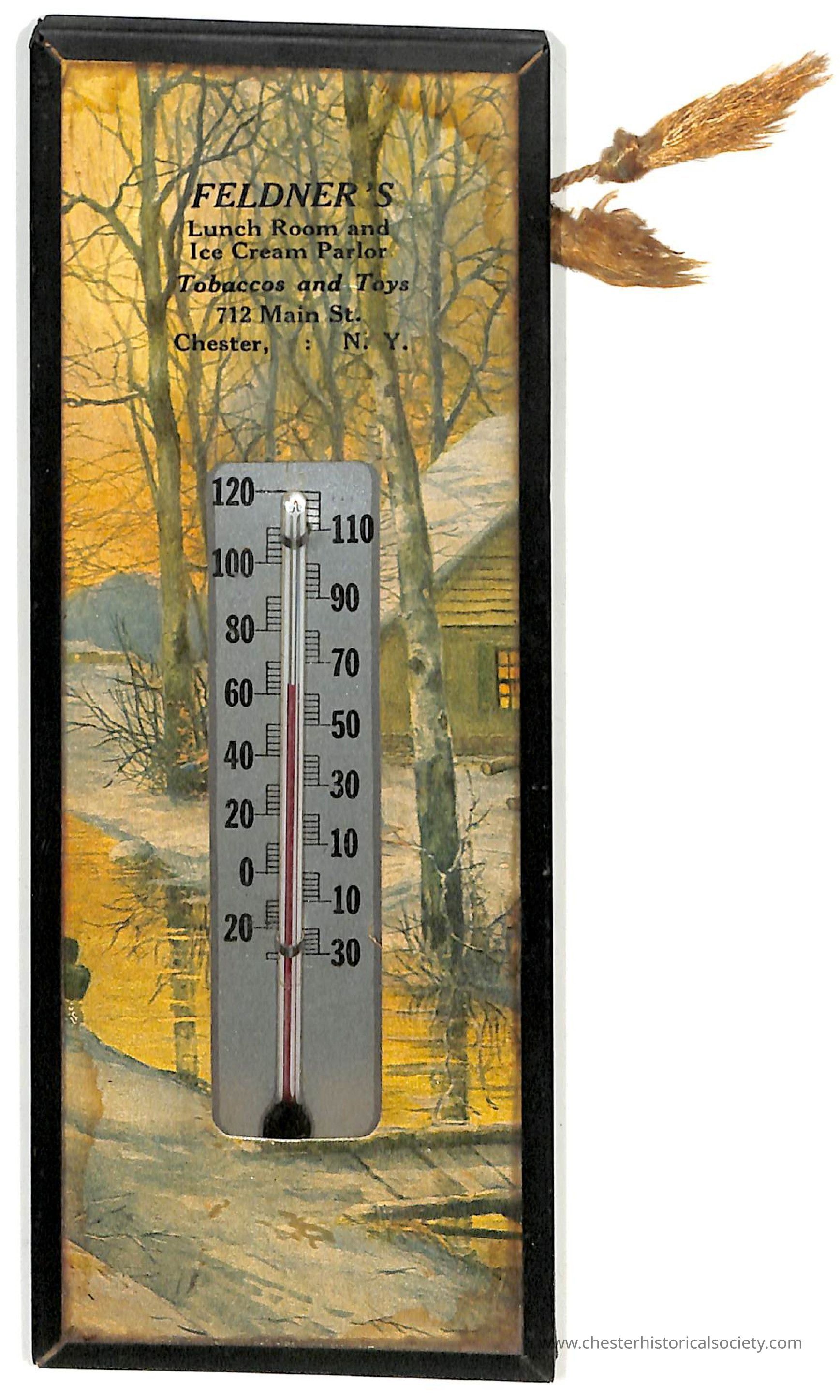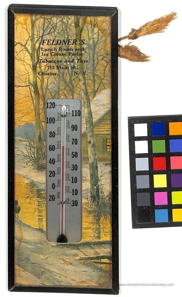 A vintage wall thermometer with a wooden frame and a scenic painting of a winter landscape, featuring tall trees and a snow-covered cabin by a stream; beside the thermometer, text advertises "Feldner's Lunch Room and Ice Cream Parlor, Tobaccos and Toys" located at 712 Main St., Chester, N.Y., encapsulating a nostalgic glimpse into a local business's promotional item.Collection