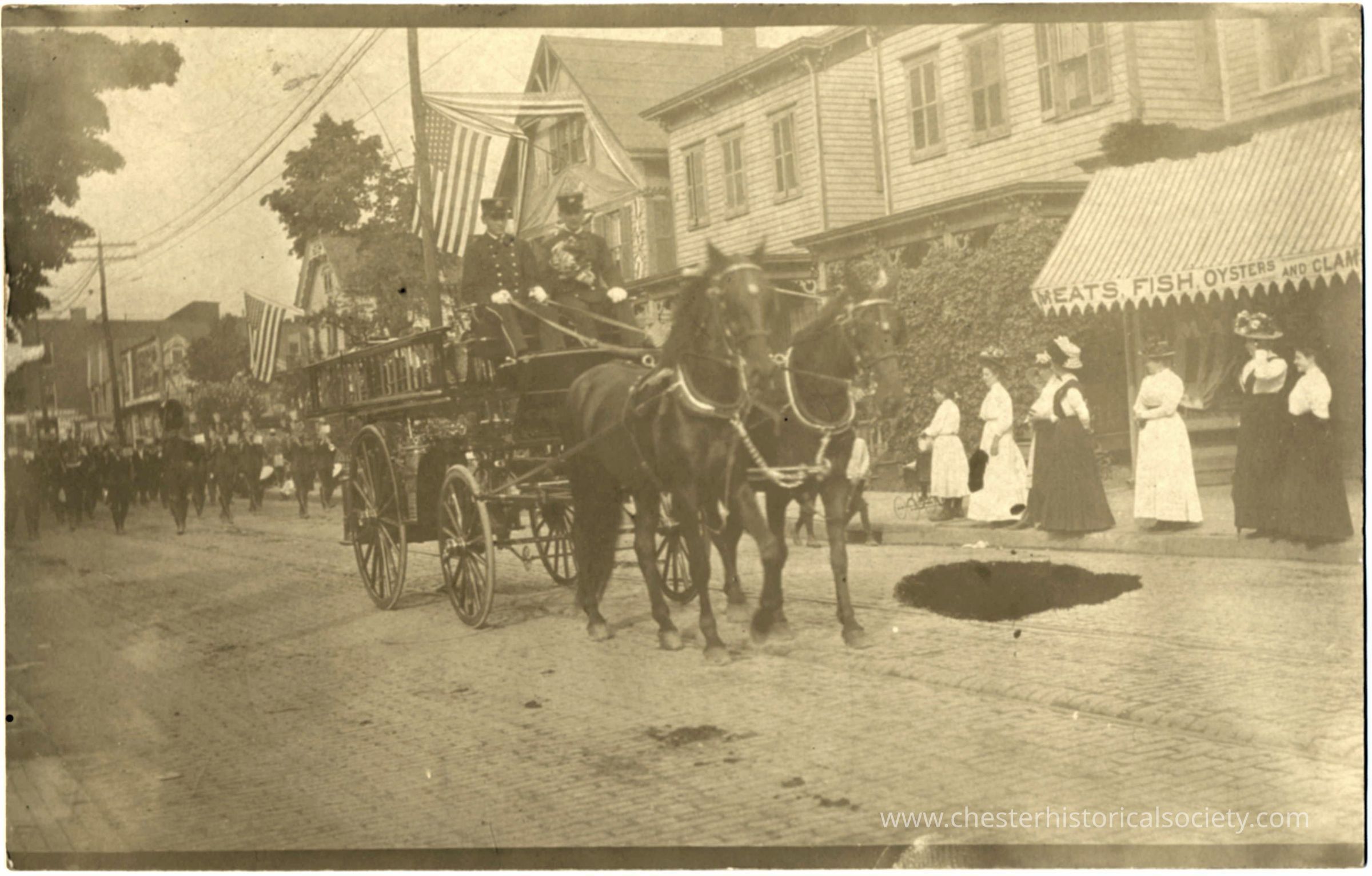 This monochrome photo postcard a bustling early 20th-century street scene adorned with American flags during a parade, featuring a horse-drawn fire engine , driven by uniformed Chester Firemen. A crowd of onlookers, including women in long dresses and men in suits, lines the cobblestone street, punctuated by a busy storefront.