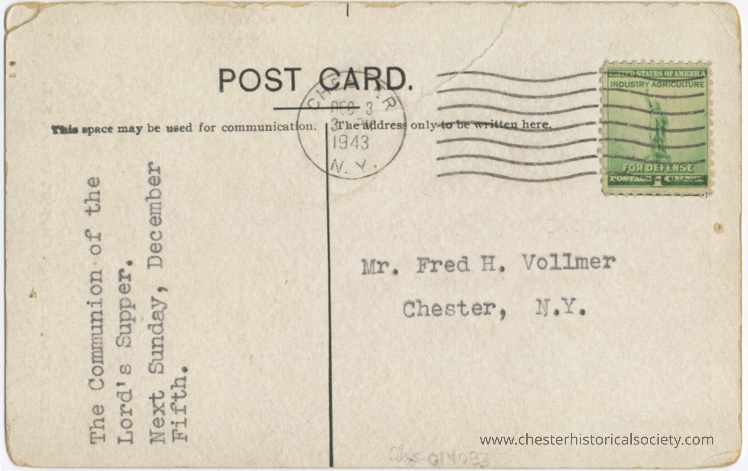 The reverse of this vintage postcard dated December 3, 1943, with a postmark from Chester, NY. It features a green "Industry-Agriculture For Defense" stamp and is addressed to Mr. Fred H. Vollmer in Chester, NY. The left side of the postcard has a faded printed message about scheduling a Lord's Supper event.Subject Person/Organization