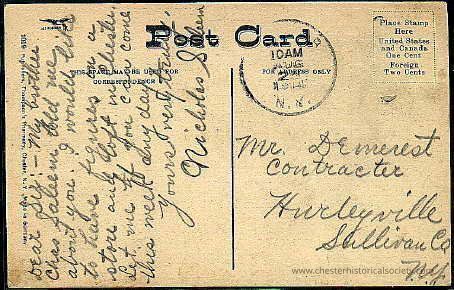 This colorized photo postcard shows a large red barn-like building labeled "Grange Store, Chester, N.Y." which was located at the intersection of Main Street and Kings Highway. The reverse features a handwritten message covering most of its surface. The card has a postmark stamped in the upper right corner, indicating it was mailed at 10 AM on August 25, 1914. The card is addressed to "Mr. Demerest, Contractor, Hurleyville, Sullivan Co., N.Y." The handwriting is cursive and there is a vertical line separating the message from the address.Subject Place