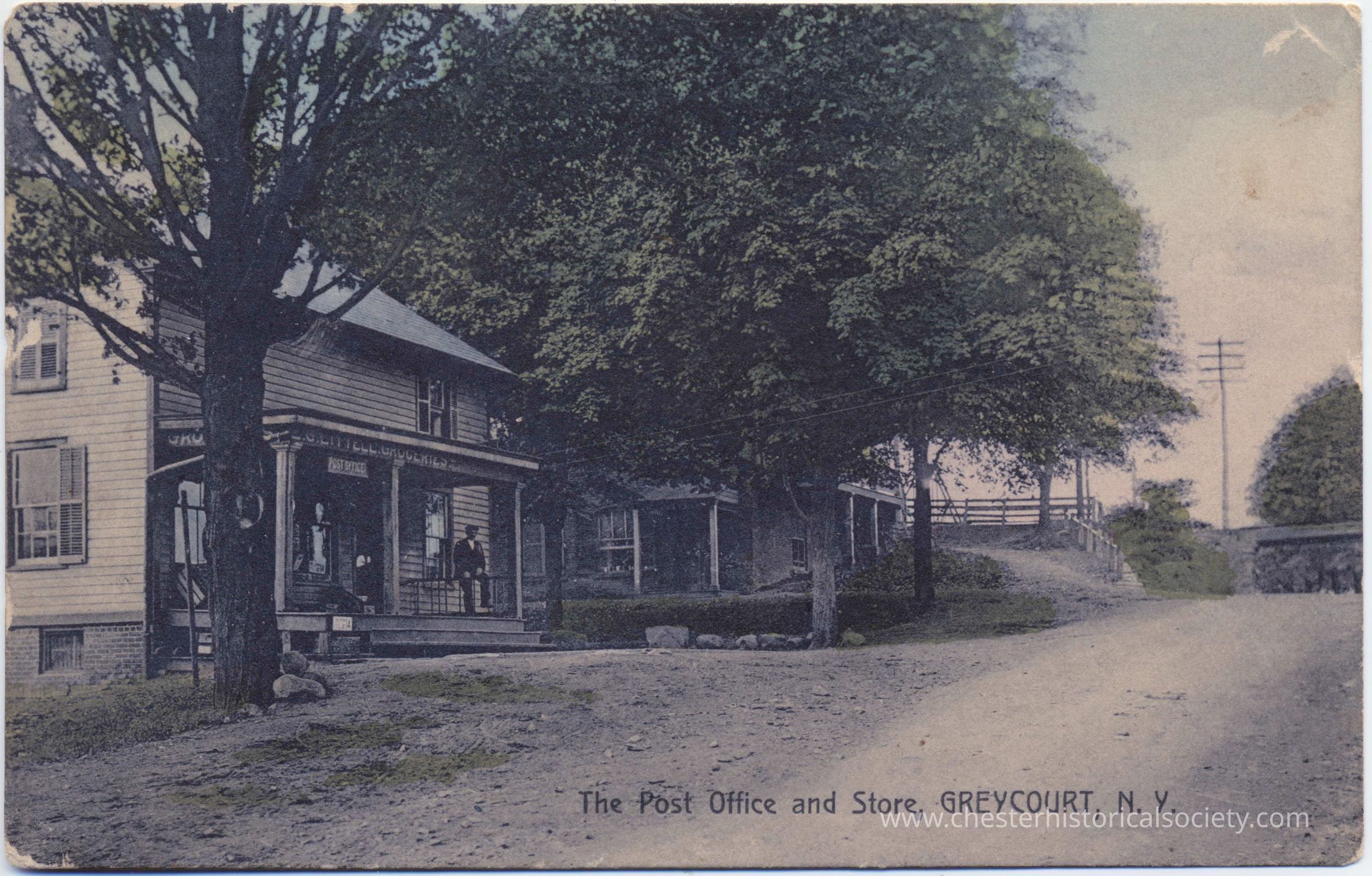 This unused colorized photo postcard depicts an early 20th-century scene showing the post office and store of Edward G. Littell in Greycourt, New York, characterized by its quaint architecture and rural surroundings, with individuals visible on the porches of the buildings shaded by large trees, and a dirt road prominently leading into the serene setting.Subject Person/Organization