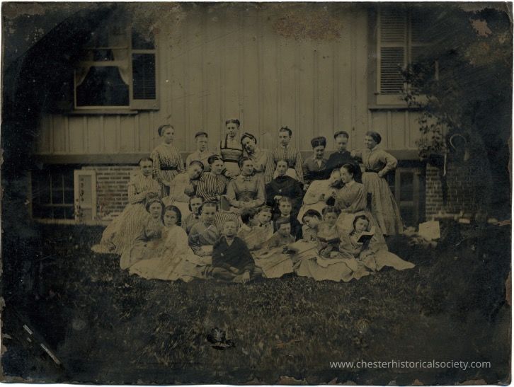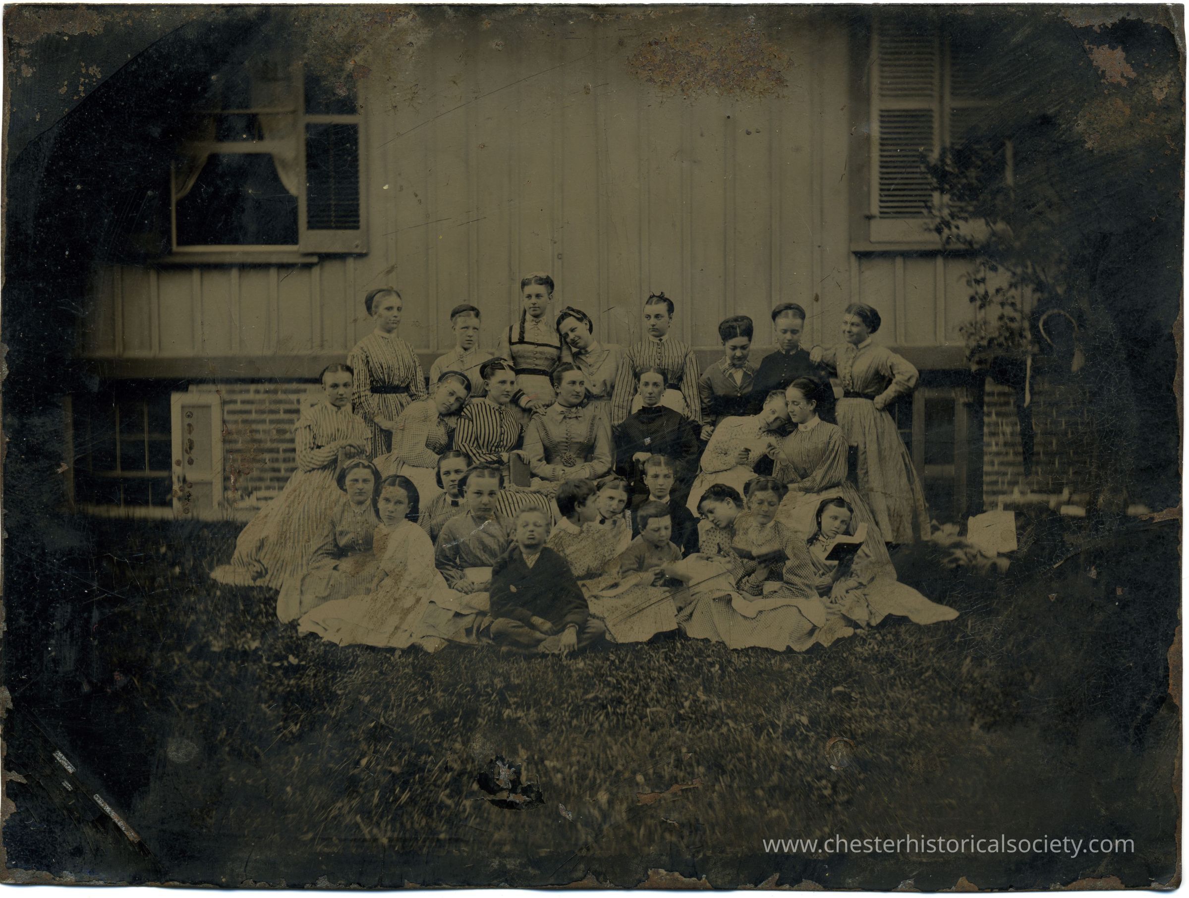 This black and white photograph portrays a group of approximately twenty-four individuals, seemingly a mix of adults and children, most likely a family or community group, posed in front of a building. The individuals, primarily women and children, wear period-appropriate attire such as striped and plain dresses with high collars, and a few are adorned with hats, suggesting the photo dates back to the late 19th or early 20th century. The tintype photo has aged.