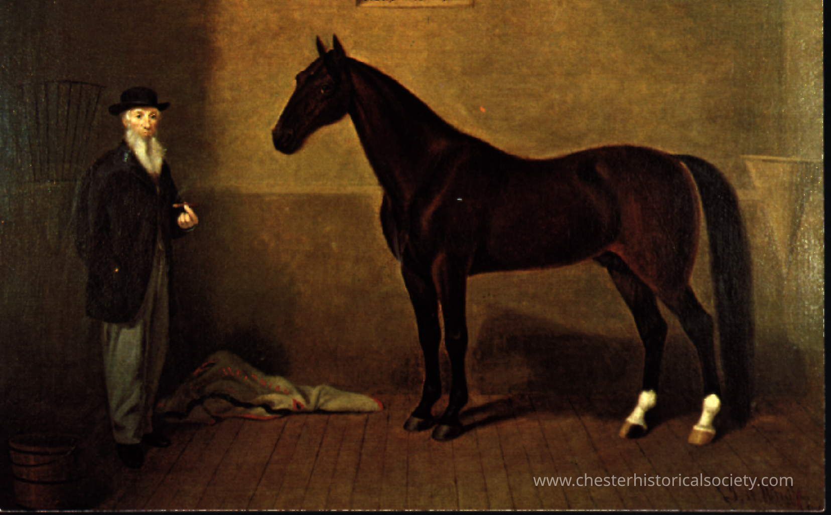 This color postcard features an image of William Mapes Rysdyk standing next to his renowned horse, Hambletonian 10, made in the likeness of James H. Wright's renowned 1856 painting "Rysdyk's Hambletonian."Subject Person/Organization