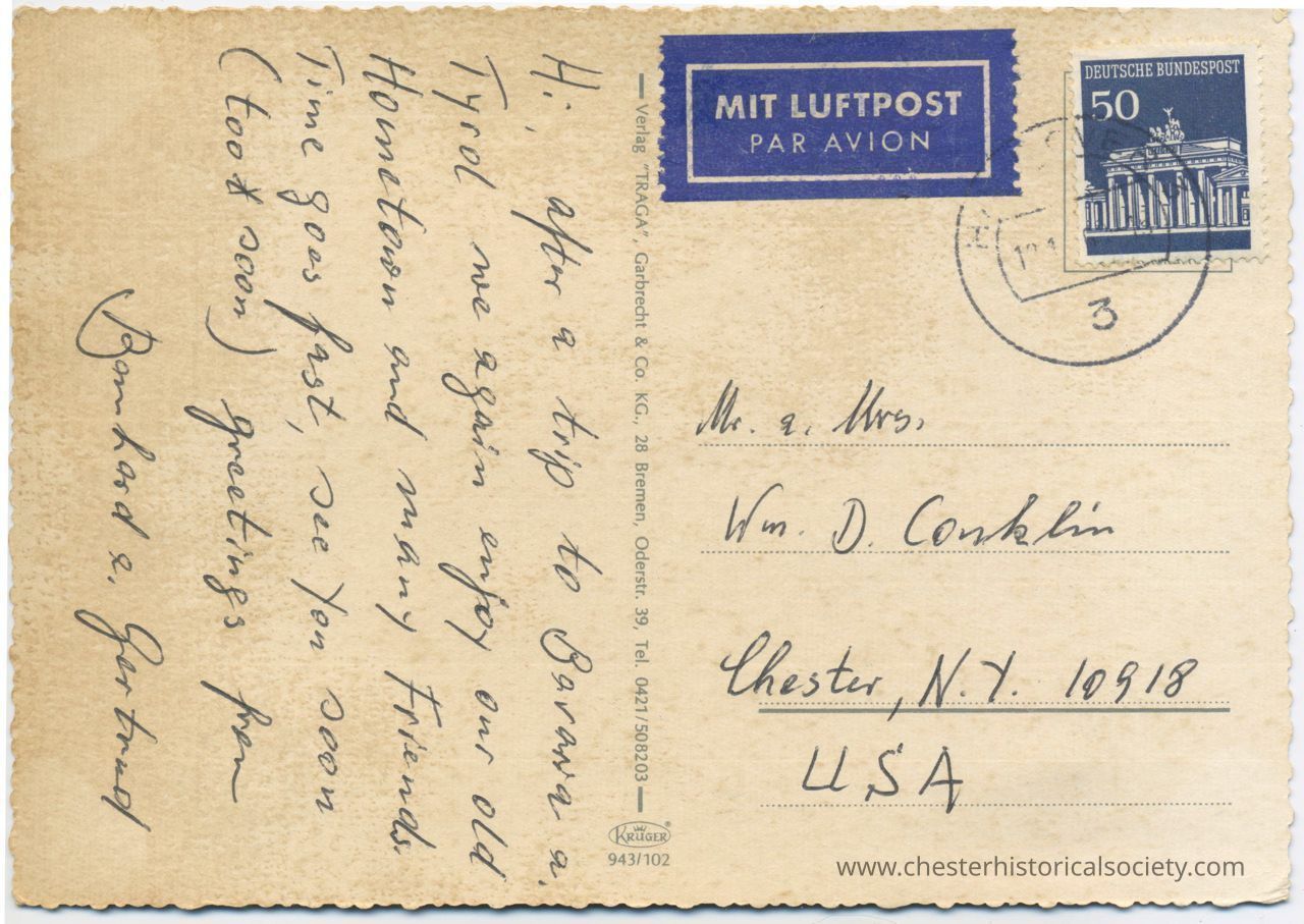 This postcard with handwritten cursive script on the left side and postal elements on the right. It features a "Mit Luftpost - Par Avion" label and a Deutsche Bundespost postage stamp depicting the Brandenburg Gate, marked with a postal cancellation. The recipient's address, "Mr. & Mrs. Wm. D. Conklin, Chester, N.Y. 10918 USA," is printed neatly in the address section.Subject Person/Organization