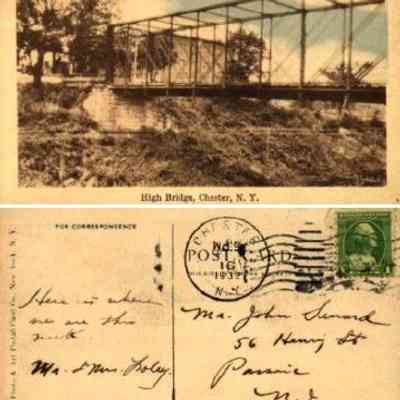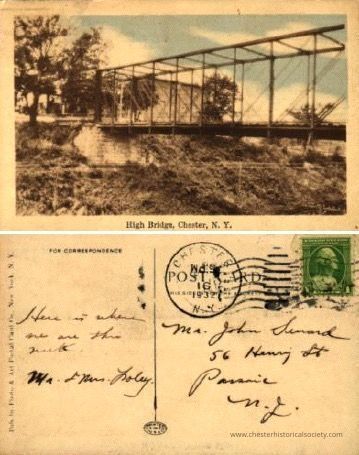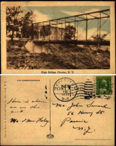 Both front and back of a color tinted postcard of High Bridge (Route 94) over the Erie Railroad tracks, Chester, N.Y.Subject