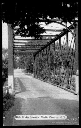 This monochrome photo postcard looks north along the Chester–Washingtonville road, through the steel truss "High Bridge' on High Street over the Erie Railroad cut, just north of the Erie Station at Chester, N. Y.Subject Place
