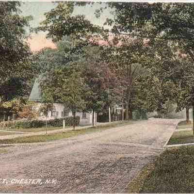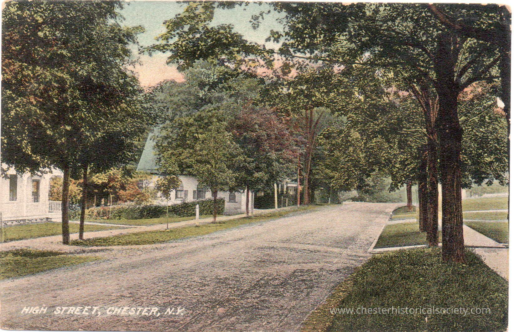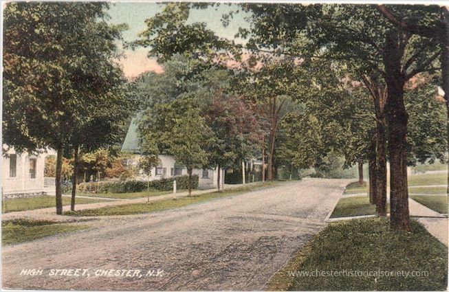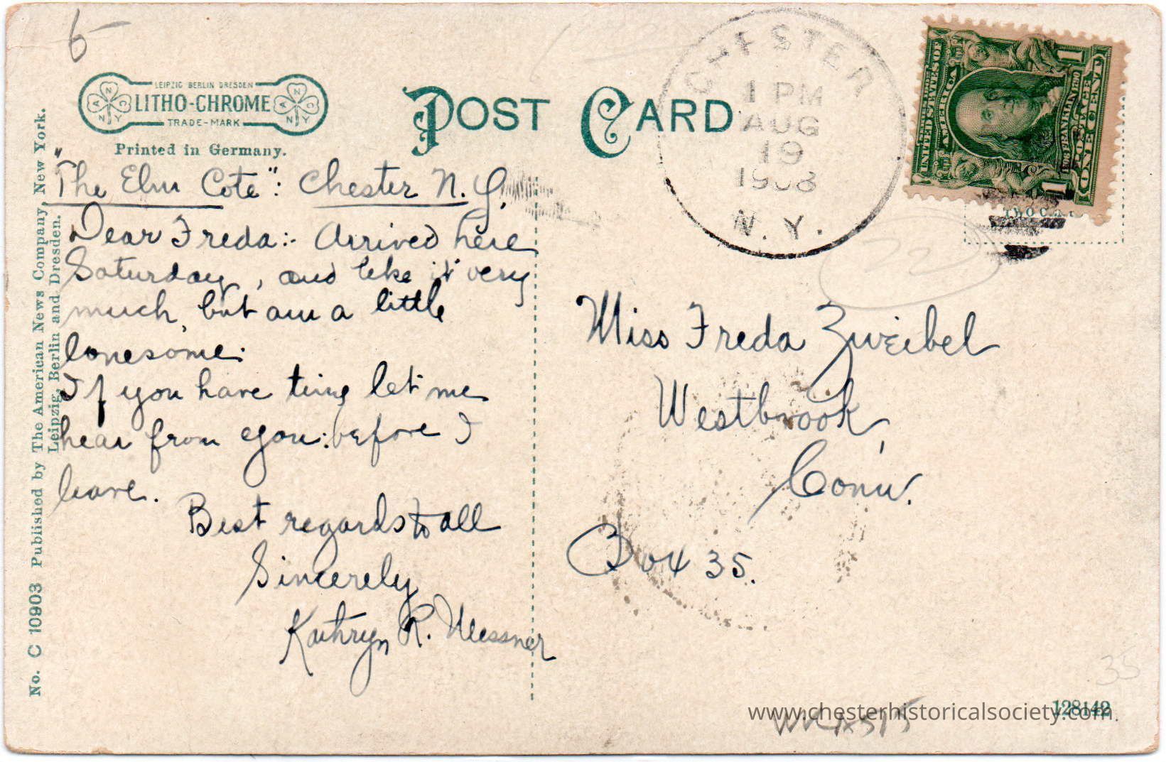 This monochrome photo postcard shows a serene view, looking south along High Street in Chester, New York, depicting a tranquil tree-lined road with quaint houses partially visible through the foliage. The address side of this vintage postcard is from Kathryn R. Wessner and addressed to Miss Freda Zweibel in Westbrook, Conn. The message is handwritten and mentions the sender's arrival in Chester, N.Y., feeling slightly lonesome. The postcard features a green one-cent stamp with Benjamin Franklin and is marked with a postal stamp from Chester, N.Y., dated August 19, 1908. The card also includes printed details identifying it as printed in Germany.Subject Place