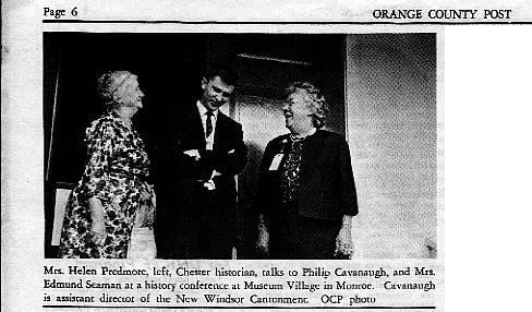Three individuals, identified in this clipping caption as Mrs. Helen Predmore, Chester historian, Philip Cavanaugh, the assistant director of the New Windsor Cantonment, and Mrs. Edmund Seaman, are engaged in a conversation at a history conference held at Museum Village in Monroe. The black-and-white photograph, featured on page 6 of the Orange County Post, captures Mrs. Predmore in a patterned dress on the left and Mrs. Seaman on the right, while Cavanaugh stands between them.