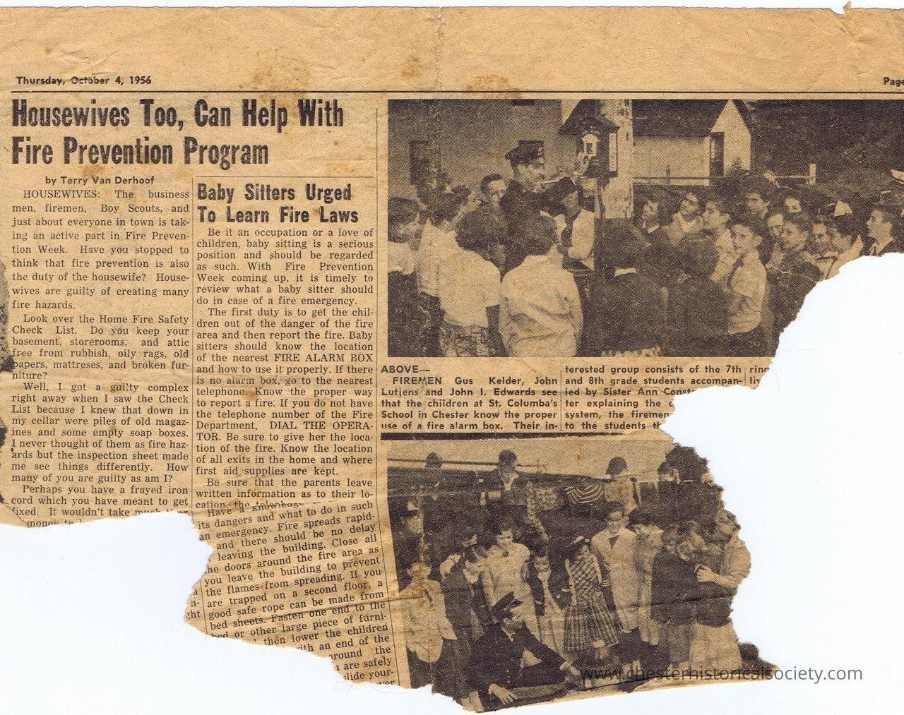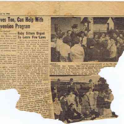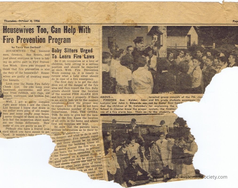 FIREMEN Gus Kelder, John Lutjens and John I. Edwards see that the children at St. Columba's School in Chester know the proper use of a fire alarm box, Their interested group consists of the 7th and 8th grade students accompanied by Sister Ann Const??? ???ter explaining the ??? system, the firemen ??? to the students ???