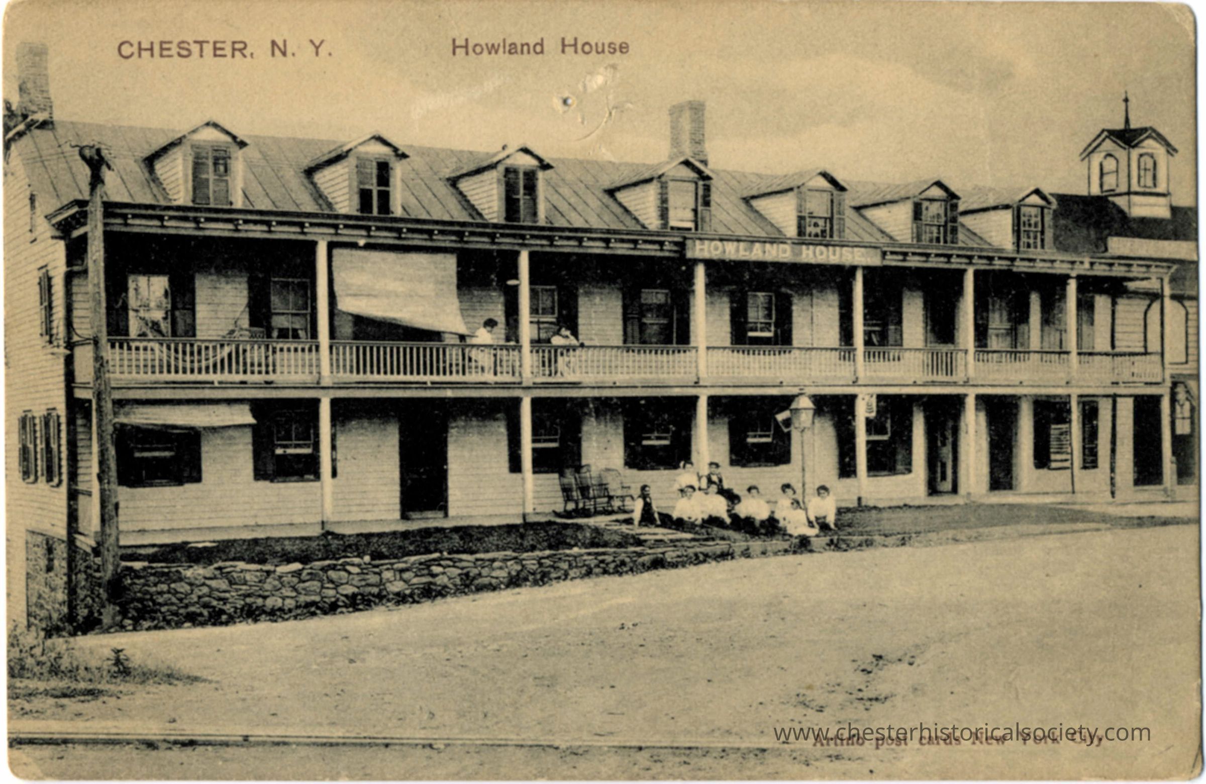 This monochrome photo postcard displays the Howland House in Chester, New York, showing a large two-story wooden building with a covered porch running across both levels. There are several people, mostly women in dresses, congregating on the lawn and balconies, lending an air of social activity to the setting. The building appears aged but charismatic, with multiple architectural details like gabled windows and a central cupola over the livery stables.Subject Person/Organization