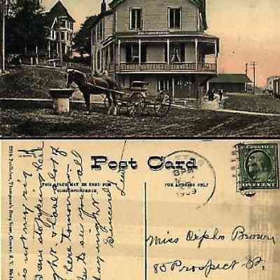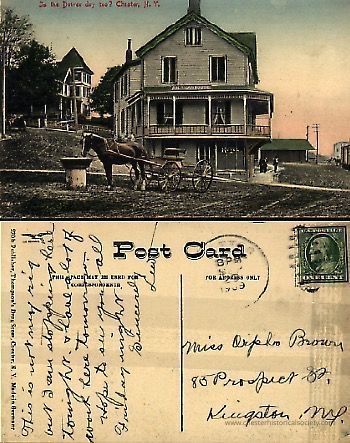“Is the Driver dry too? Chester, N.Y.” Color photo Post Card #270b by Thompson’s Drug Store of the America House, mailed 3pm 29 Sept, 1909 to Miss Orpha Brown, Kingston, NY from Lew.Create Date