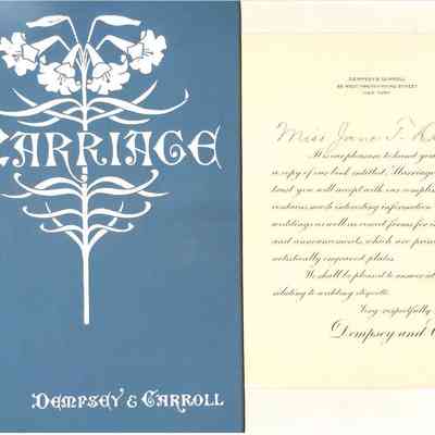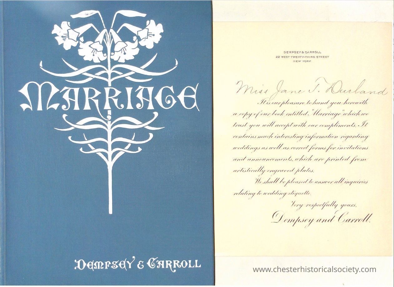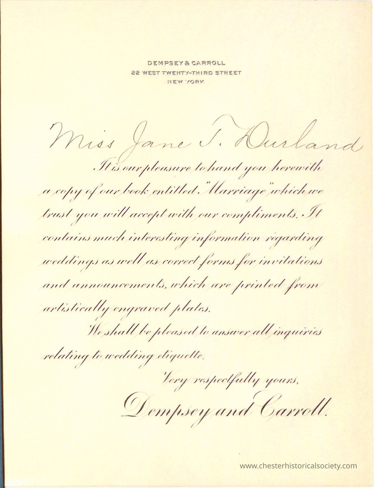 Jane T. Durland's Dempsey & Carroll Marriage book, including a loose insert in the form of a formal letter on a cream-colored background, elegantly written in cursive script, addressed to Miss Jane T. Durland from Dempsey & Carroll, located at 22 West Twenty-Third Street, New York. The letter expresses pleasure in presenting a copy of their book, "Marriage," containing information on weddings, invitations, and announcements. It mentions that the content is printed from artistically engraved plates and offers to answer inquiries regarding wedding etiquette.Collection