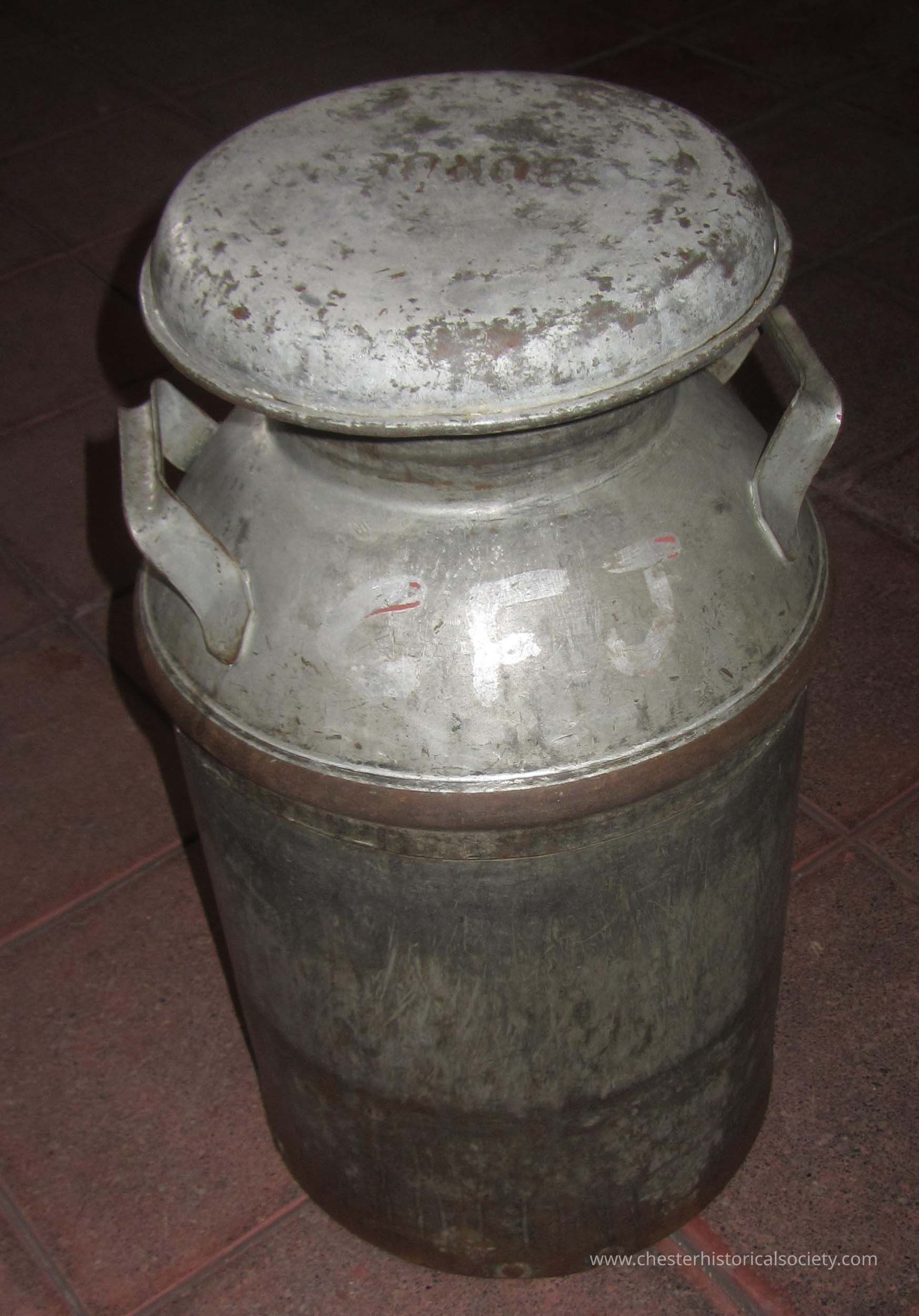 Before bulk tanker trucks picked up raw milk from farms, milk was transported daily to local creameries for processing, typically in 10 gallon metal milk cans such as this one. Most farms marked or otherwise identified their cans to ensure that the creamery returned their cans to them after emptying the contents and steam-cleaning (sterilizing) them.Context