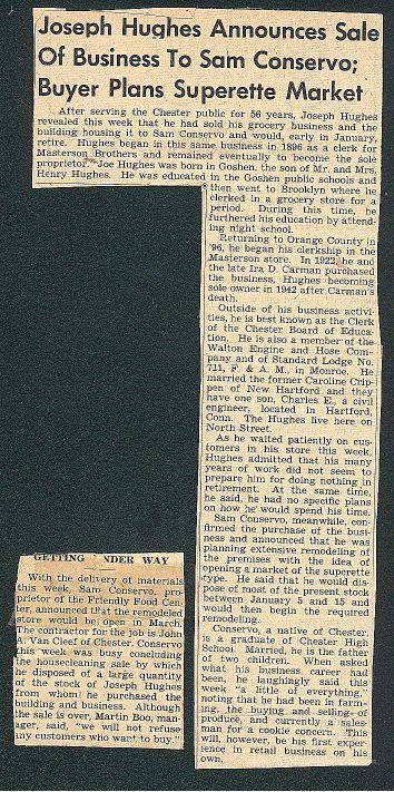 After serving the Chester public for 56 years, Joseph Hughes revealed this week that he had sold his grocery business and the building housing it to Sam Conservo and would, early in January, retire. Hughes began in this same business in 1896 as a clerk for Masterson Brothers and remained eventually to become the sole proprietor: Joe Hughes was born in Goshen, the son of Mr. and Mrs. Henry Hughes. He was educated in the Goshen public schools and then went to Brooklyn where he clerked in a grocery store for a period. During this time, he furthered his education by attending night school.