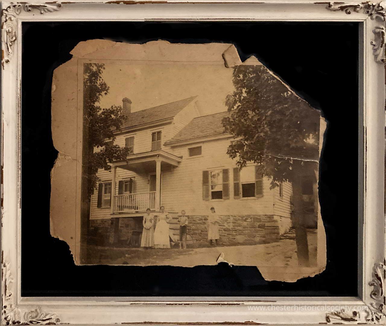 A framed photo of the Tyrone-Derry Farmhouse occupied by the Kane family before the full-width front porch was added to this charming two-story house, featuring a front porch, positioned within a damaged ornate white frame. A group of individuals, three ladies and one boy - possibly Kanes, are standing in front of the house, enhancing a serene domestic scene that might evoke nostalgia for a bygone era.Photograph Details
