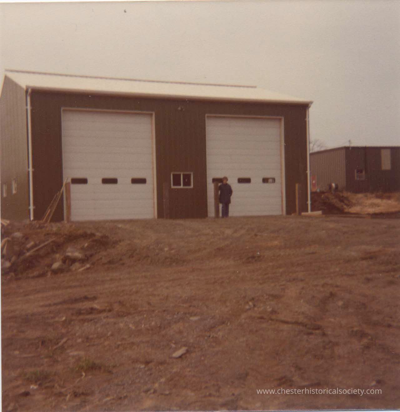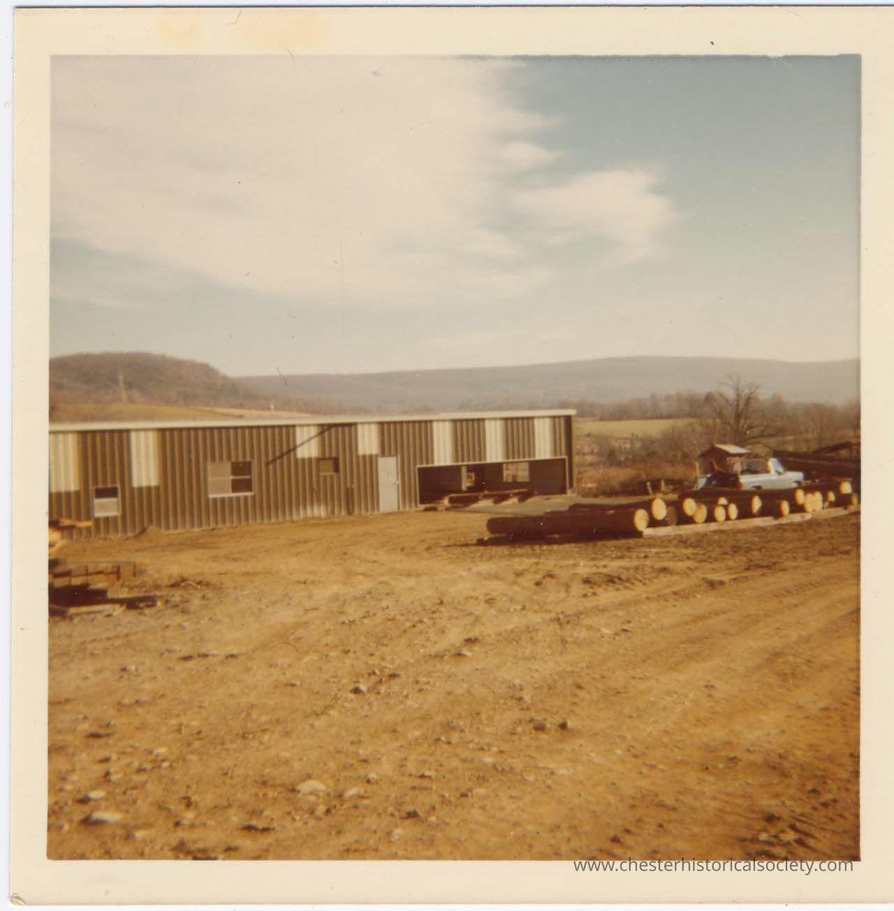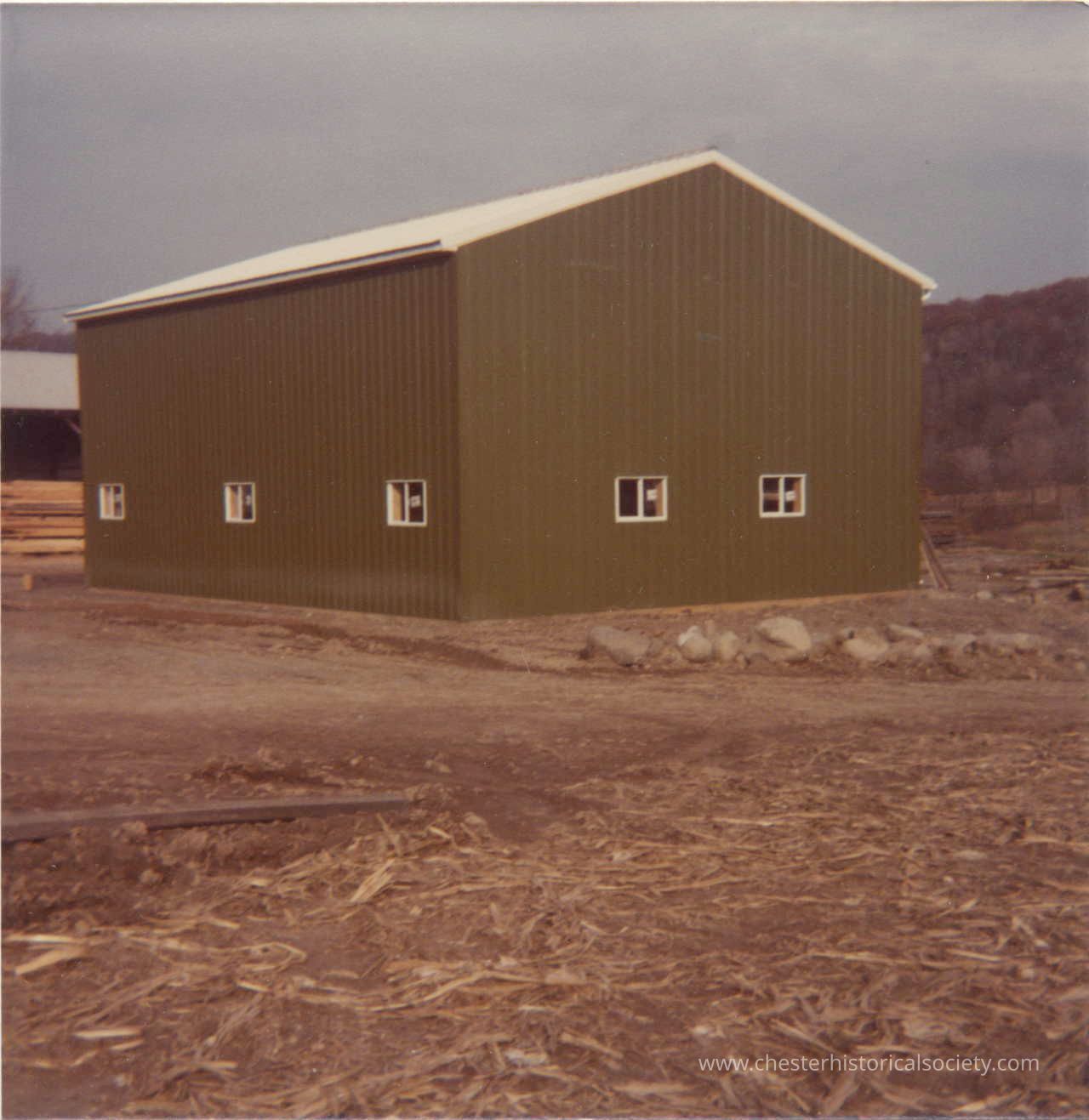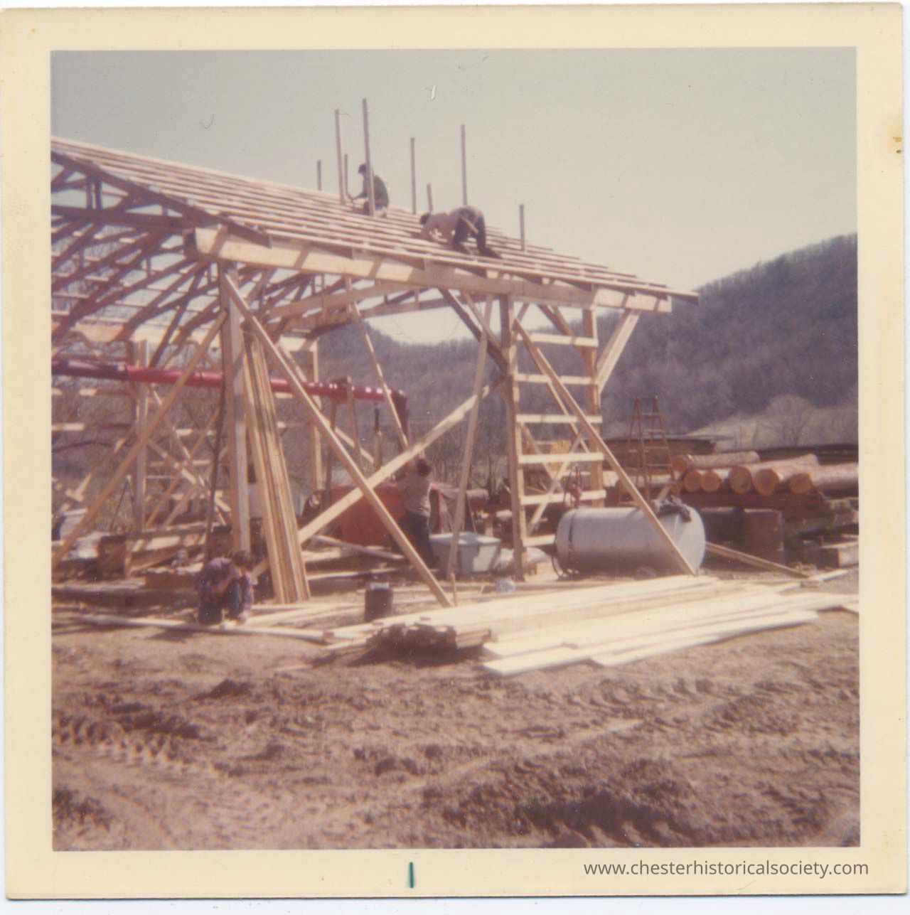 046 April, 1974. Chardavogne men putting up building over portable mill - Pipe is for sawdust to building