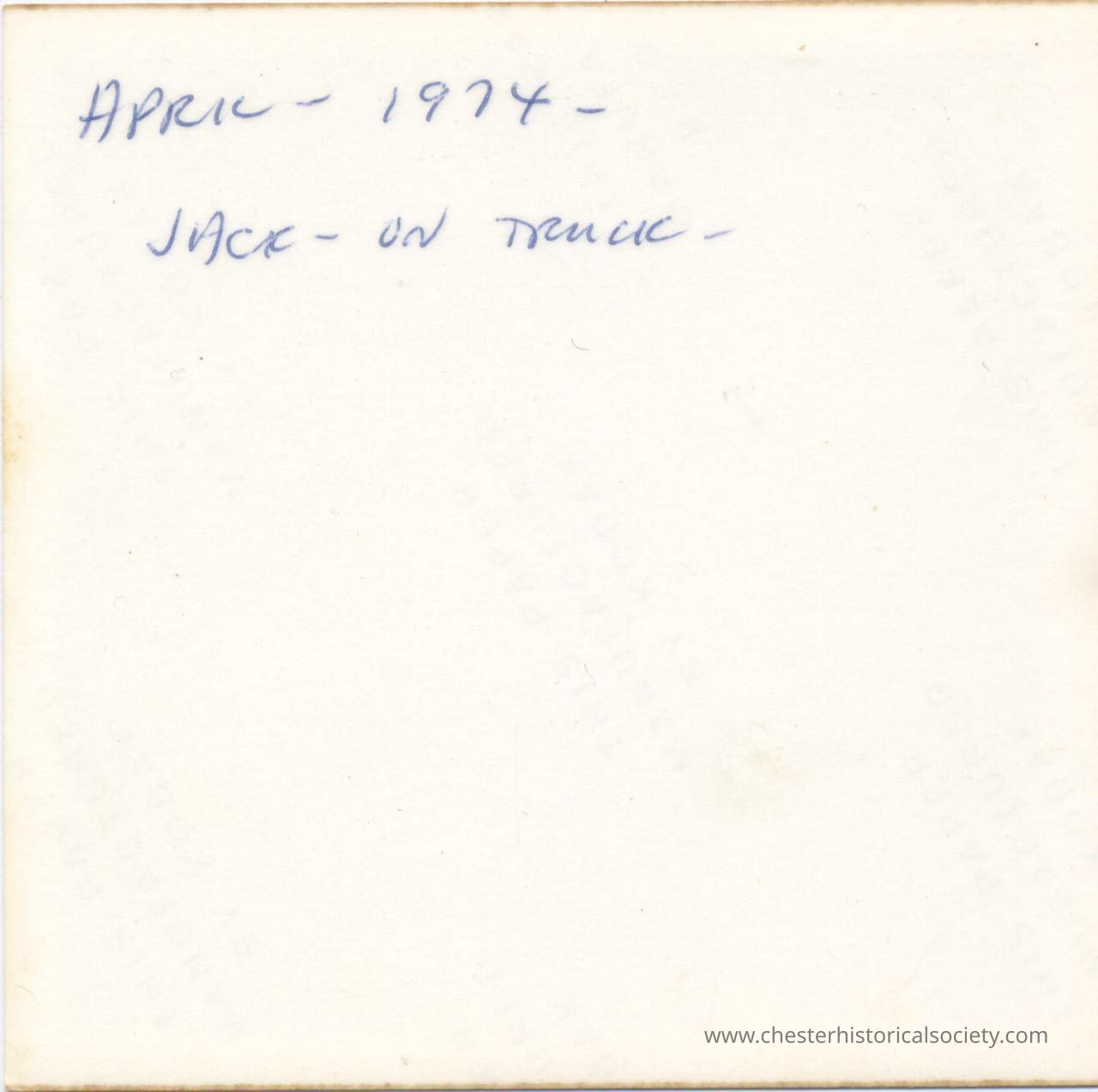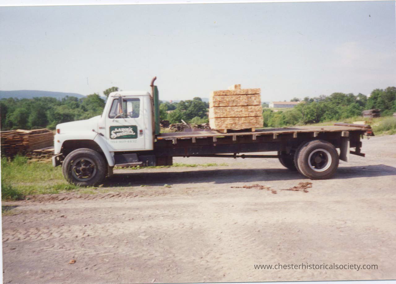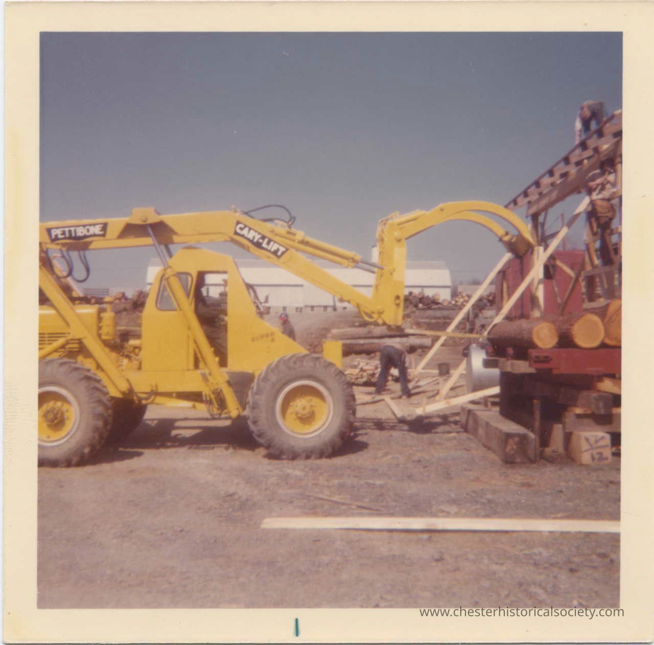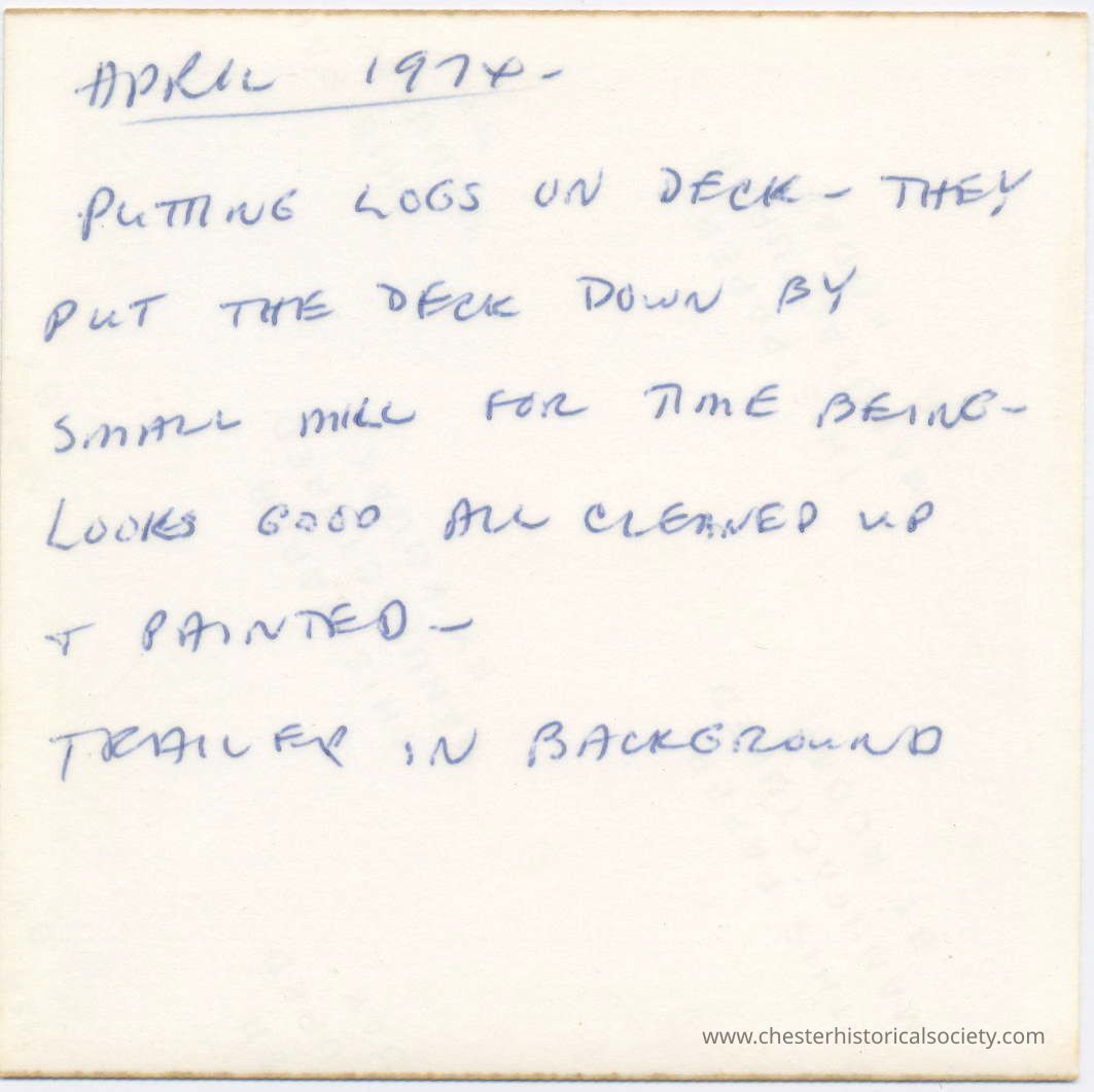 056 April 1974 Putting logs on deck - They put the deck down by small mill for time being - Looks good all cleaned up & painted. Trailer in background
