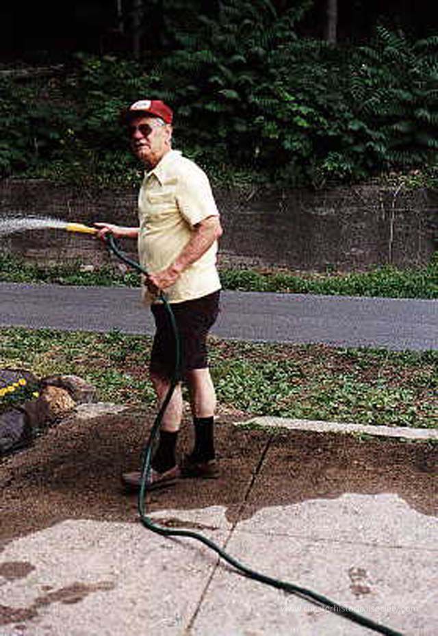 Larry Neeb watering flower bed along trail behind 1915 Erie Station.Photograph Details