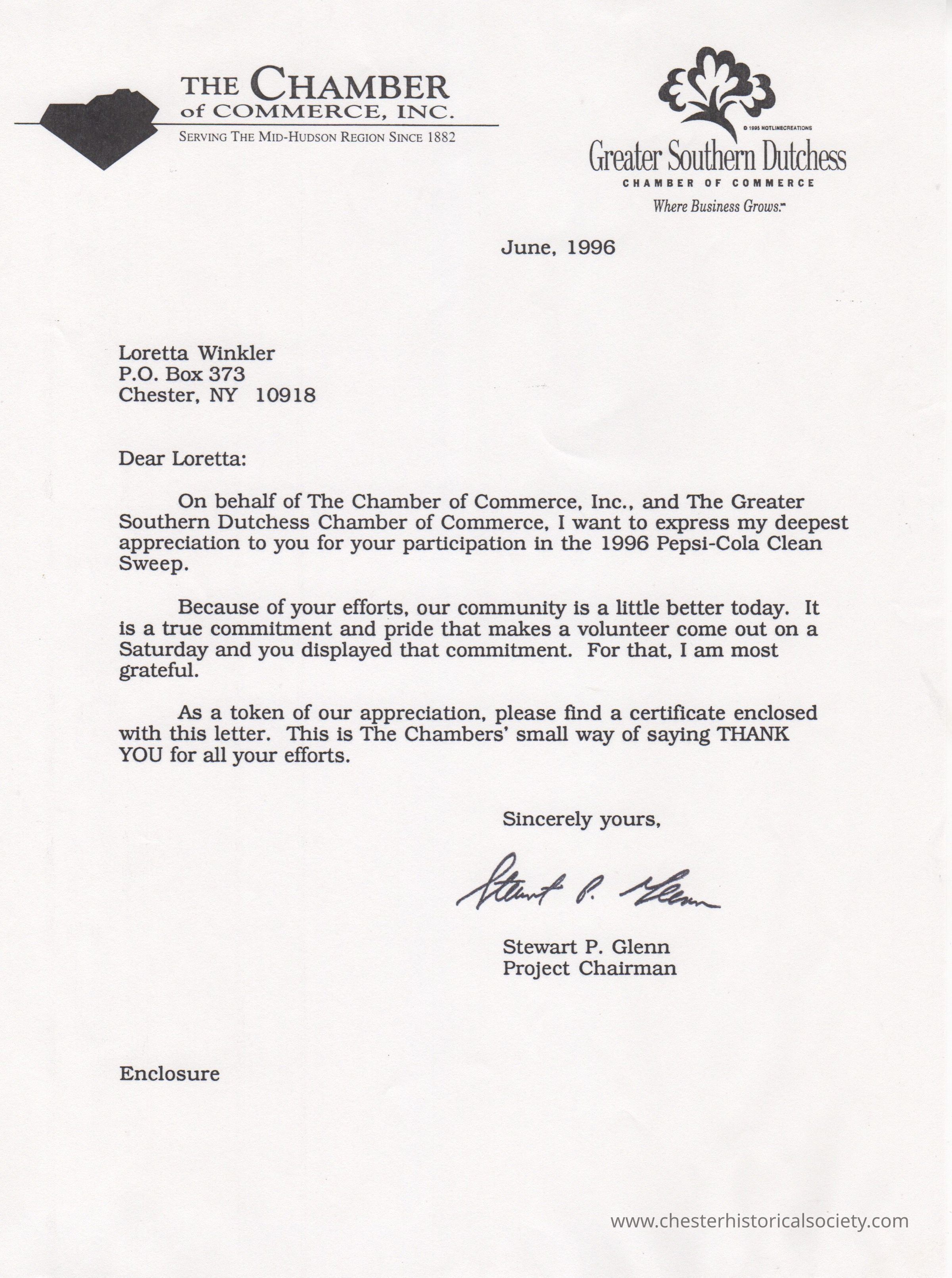 Certificate of Appreciation issued by The Chamber of Commerce and Greater Southern Dutchess Chamber to Loretta Winkler onApril 27, 1996, accompanying letter.Subject Person/Organization
