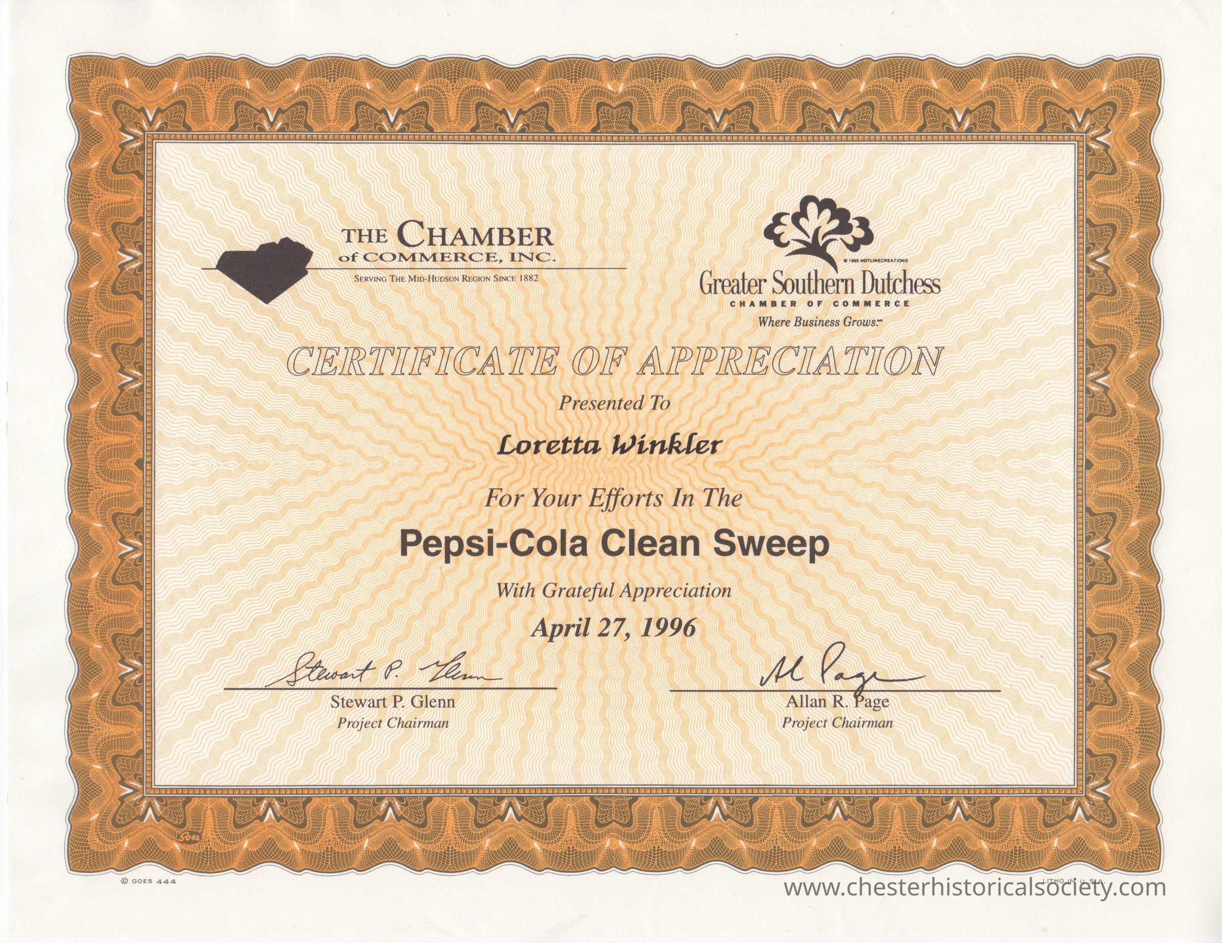 Loretta Winkler - Pepsi-Cola Clean-Sweep CertificateEntry/Object ID