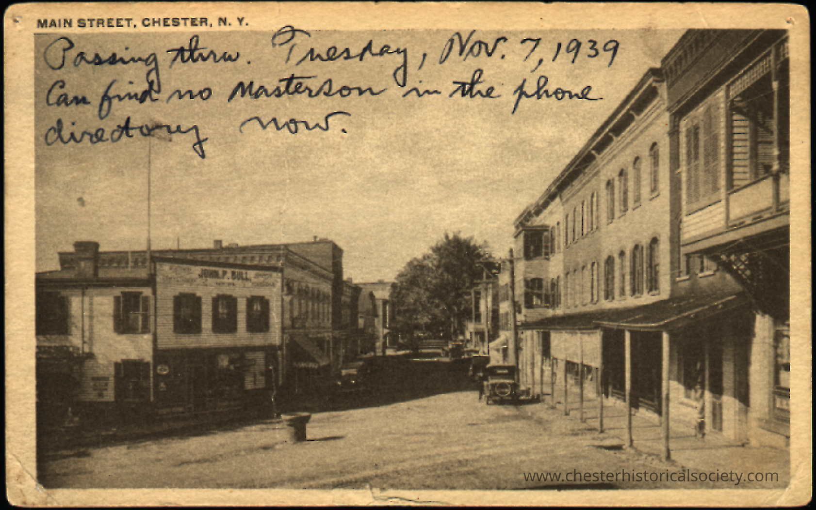 Postcard from CHESTER,NEW YORK. This View shows "MAIN STREET" and the JOHN P. BULL Store on Left.Create Date