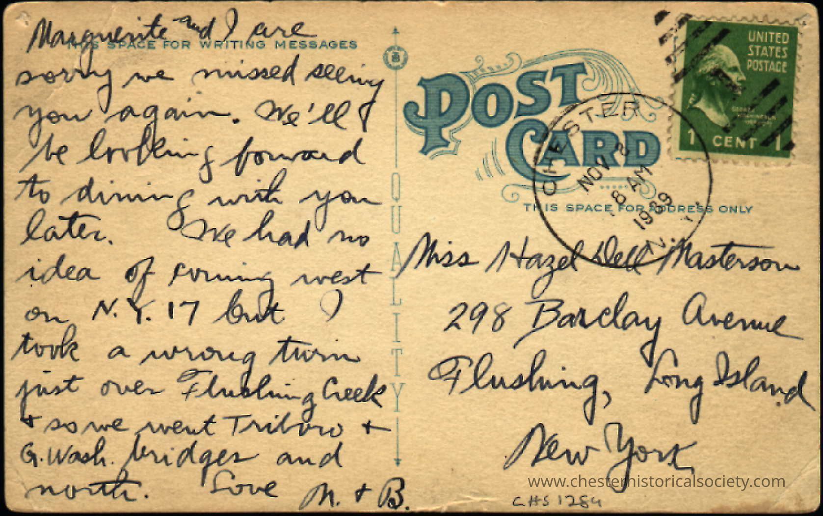 This image is a sepia-toned postcard depicting Main Street in Chester, New York, dated November 7, 1939. It shows a quiet, old-fashioned street lined with two- and three-story commercial buildings, featuring signage such as "John J. Bull," a stationery-cigar store. An early model car is parked on the side of the street. The photo includes a handwritten message saying, "Passing thru. Tuesday, Nov 7, 1939. Can find no Masterson in the phone directory now." The image is an aged postcard, featuring an intricate handwritten message and addressed to Miss Hazel Bell Masterson at 298 Barclay Avenue, Flushing, Long Island, New York. The left side of the postcard contains text expressing regrets for a missed meeting and plans for a future visit, mentioning a wrong turn near Flushing Creek. The right side shows a green one-cent stamp, postmarked and canceled.Subject Place